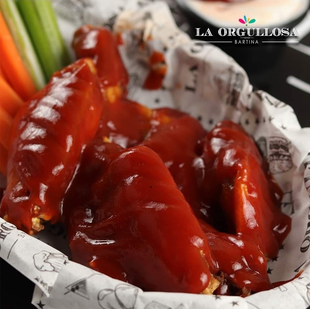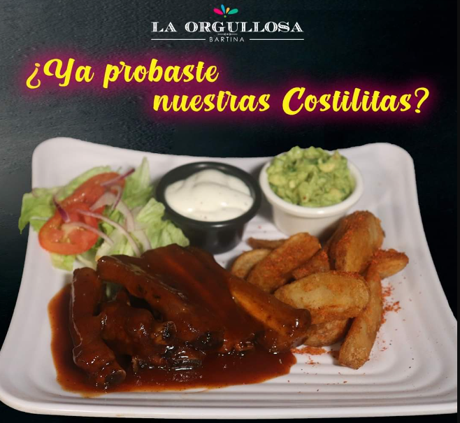 Costillita de cerdo, bañadas en salsa a tu eleccion. Acompañadas de papas gajo, ensalada fresca, aderezo ranch y guacamole.