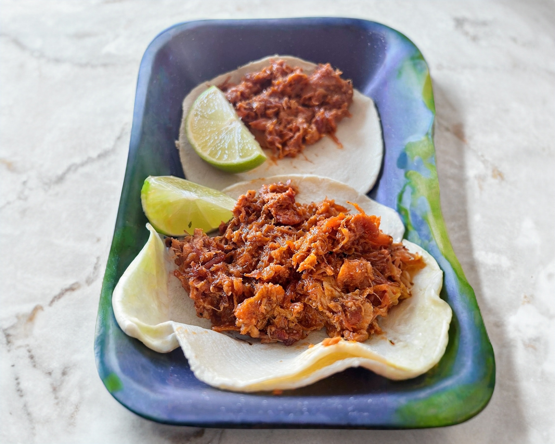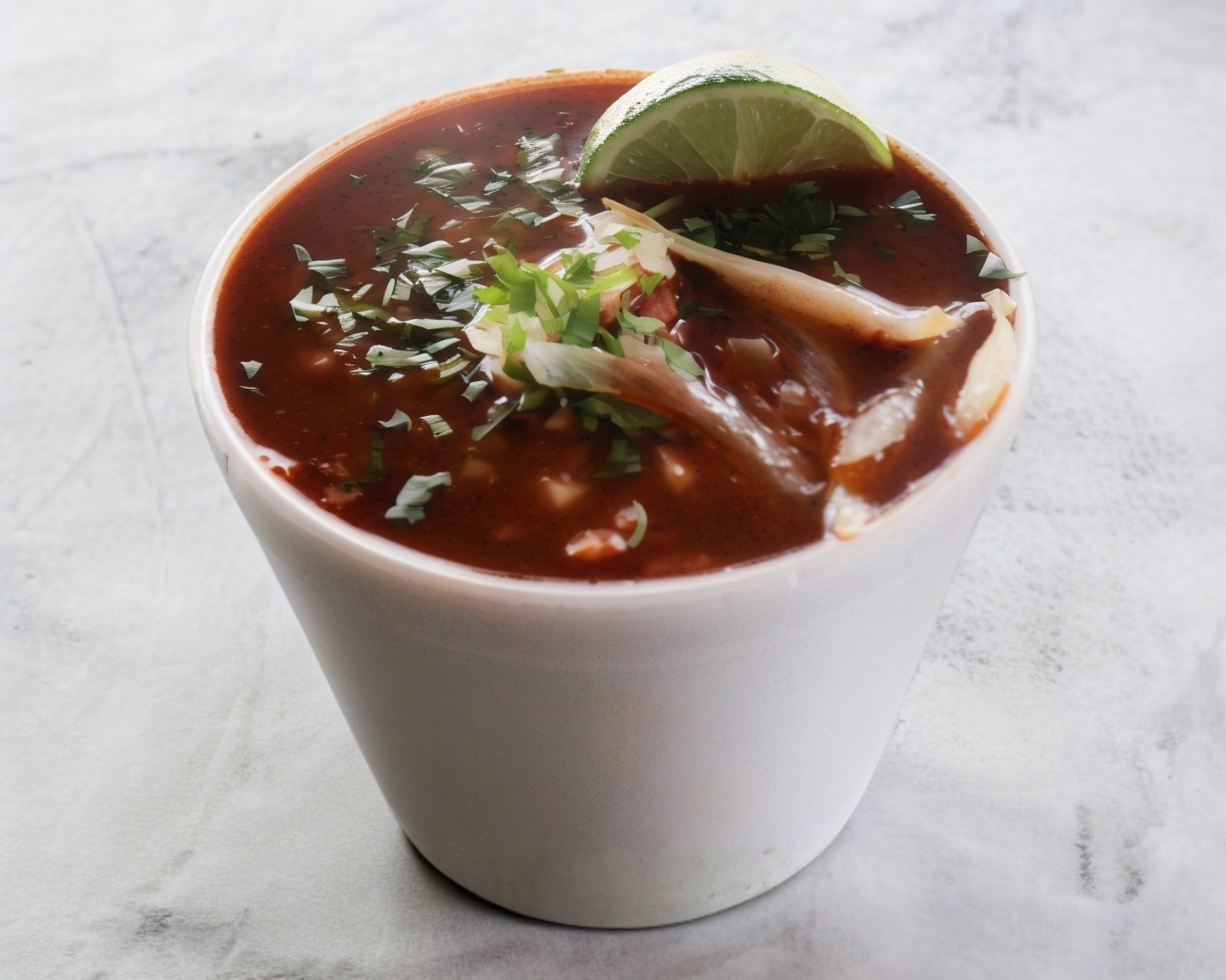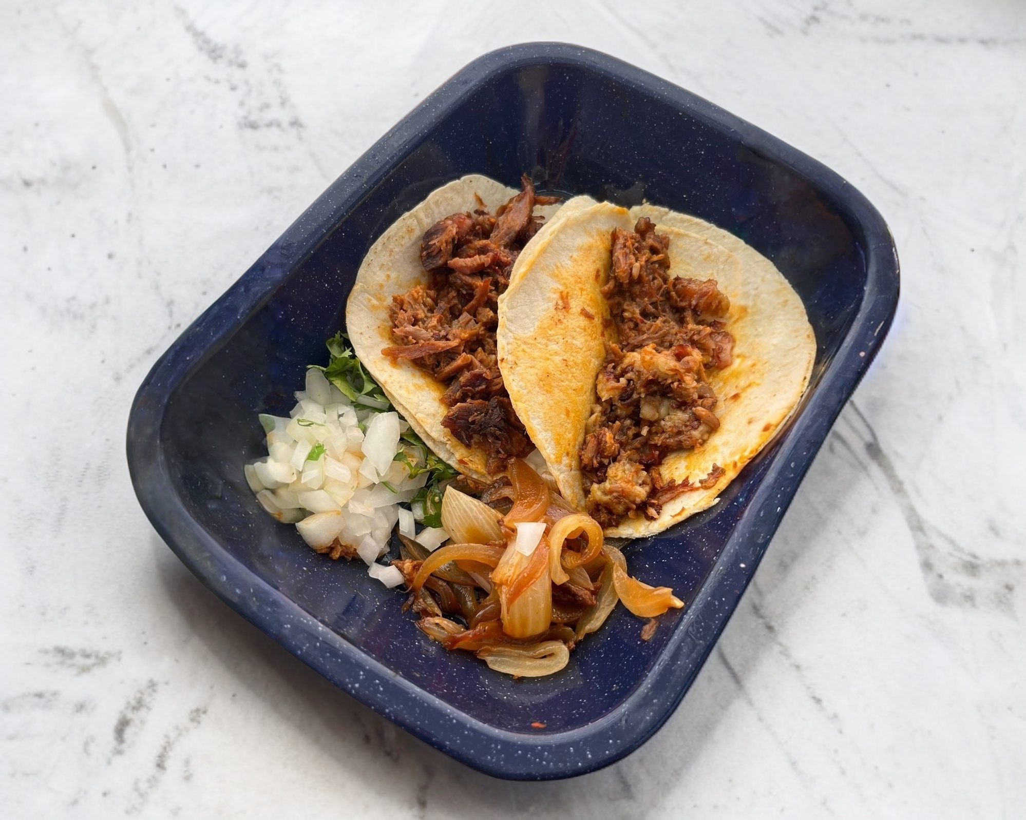 Quesadilla de maíz de birria con cebolla, cilantro y consomé.