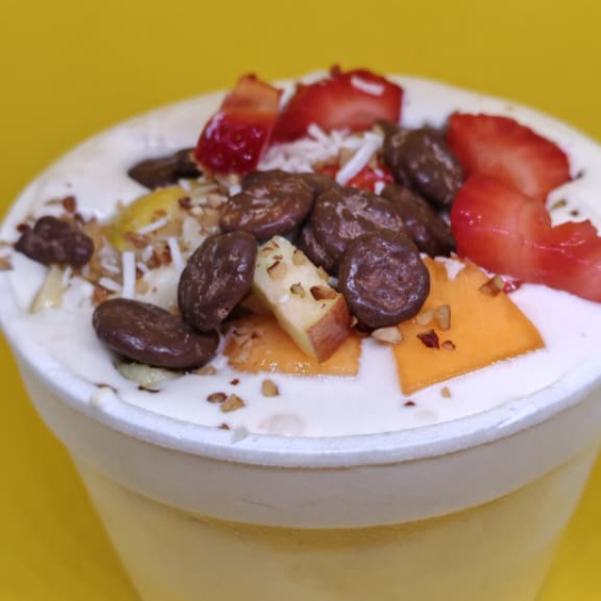 Fruta fresca de temporada: plátano, manzana, melón, papaya, uva, fresa, guayaba con 2 toppings de tu elección.