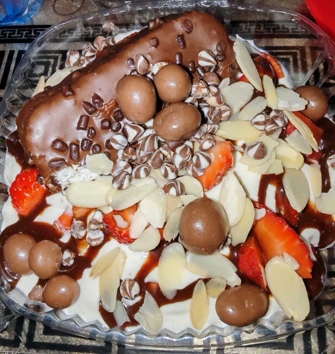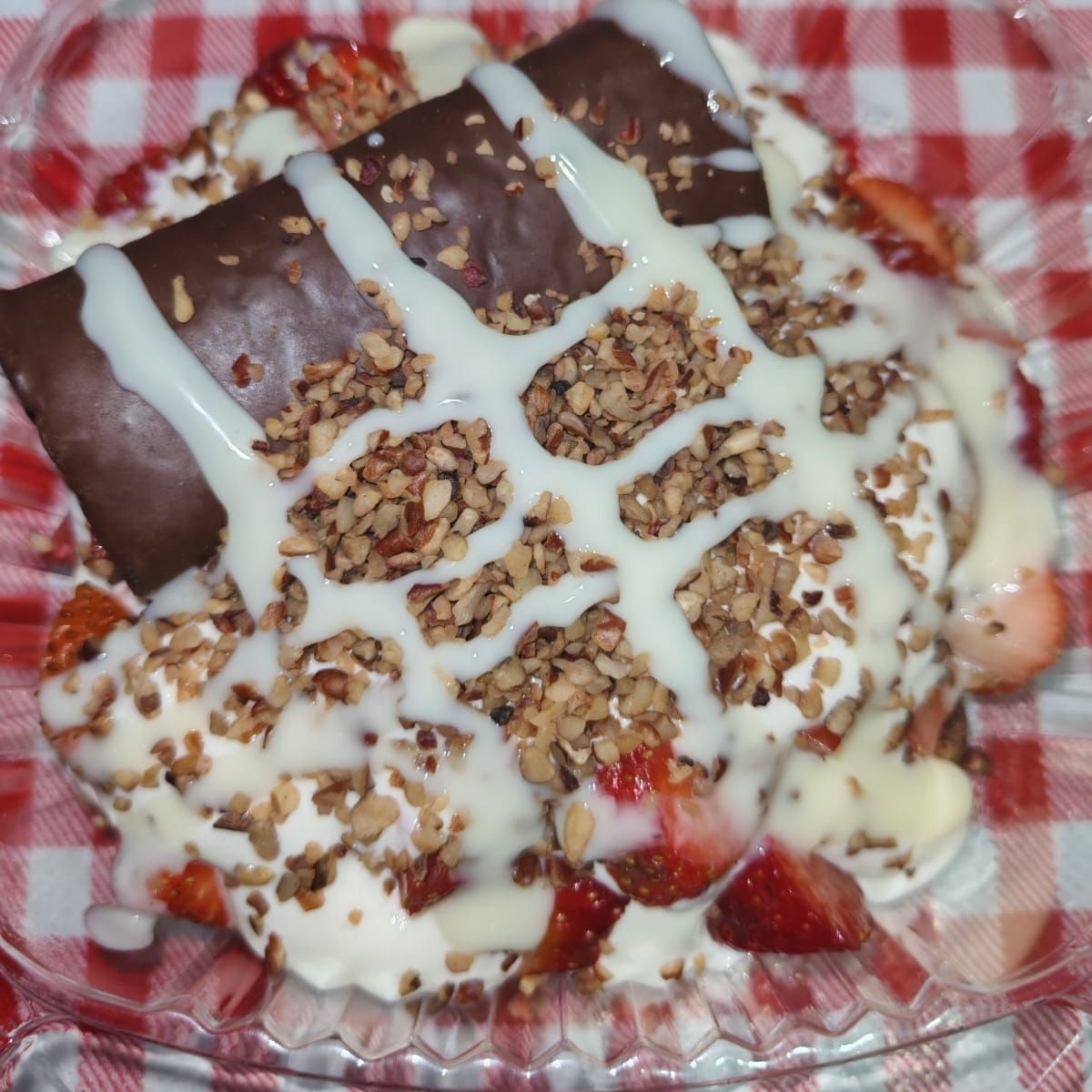 Preparación frutal con fresas y pingüino.