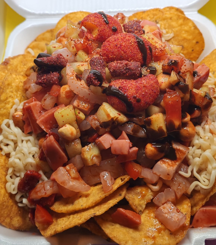 Papas a elección con cueritos, salchichas, pepino, jitomate, cebolla, cacahuates, rielitos, manguito enchilado, clamato, salsas negras, picante, tajín, limón y sal.
