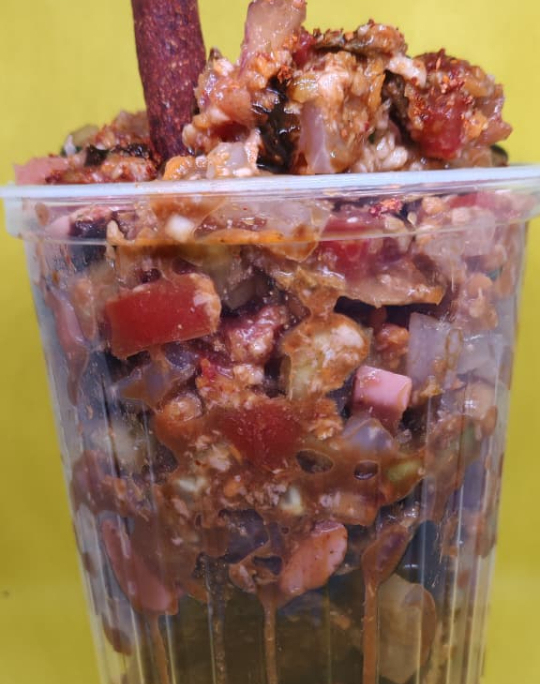 Papas naturales, papas salseadas o papas adobadas con ceviche de camarón, pepino, jitomate, cebolla, cacahuates, rielitos, manguito enchilado, clamato, salsas negras, picante, tajín, limón y sal.