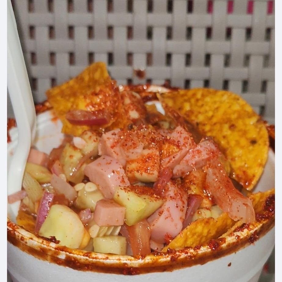 Tostitos mixtos: llevan camarón, ceviche de pescado, cueritos, salchichas, pepino, jitomate, cebolla, cacahuates, rielitos, clamato, salsas negras, picante, tajín, limón y sal.