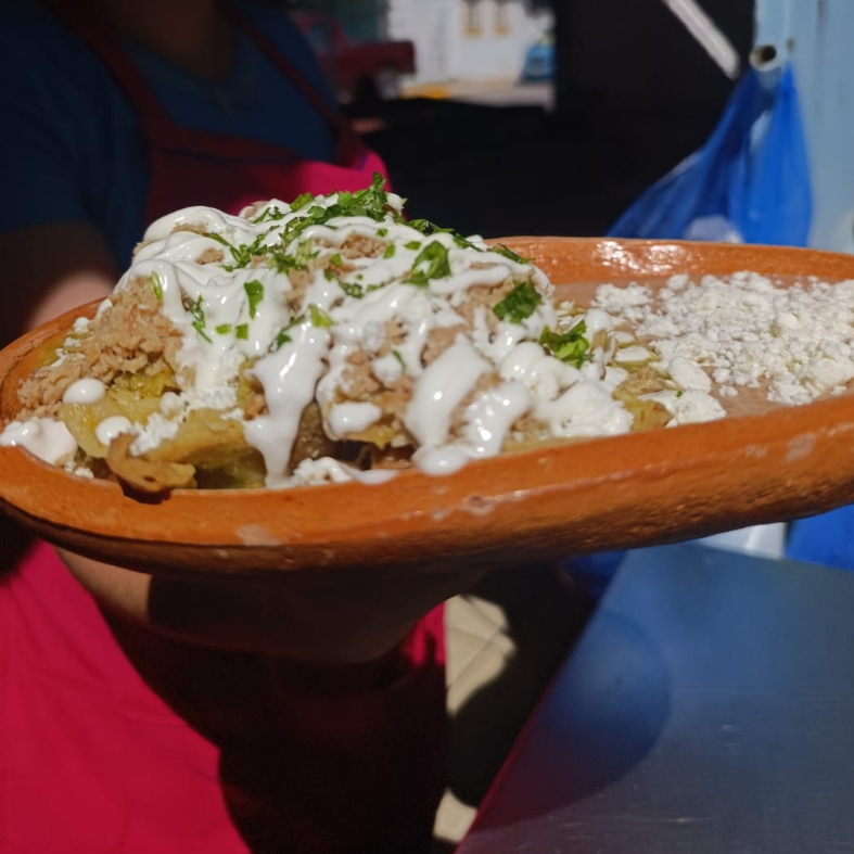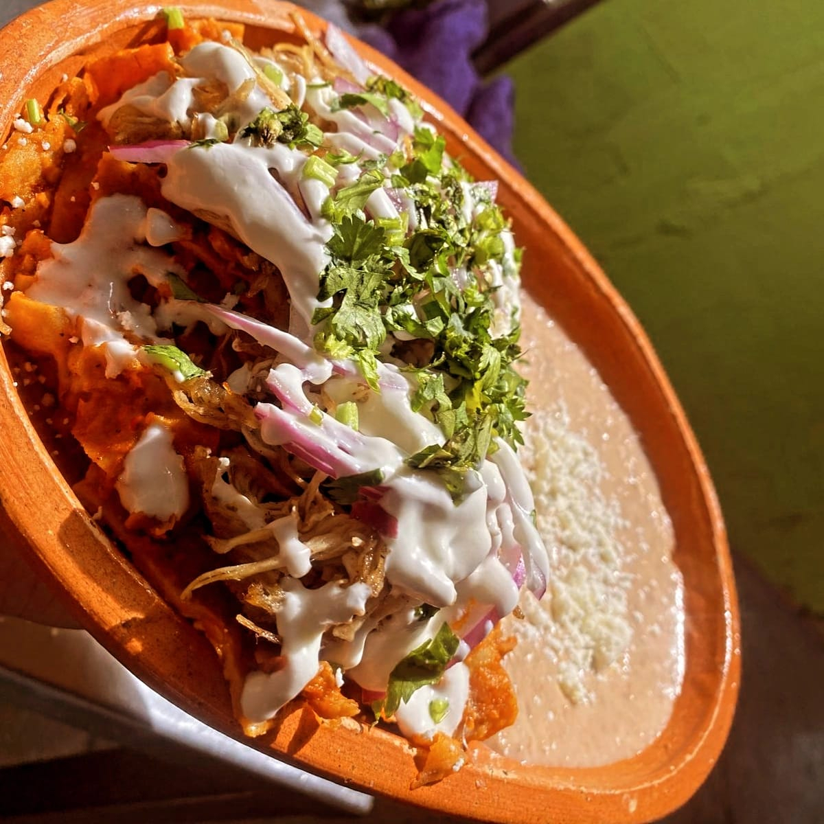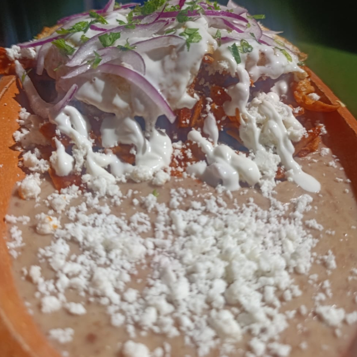 Totopos bañados en salsa con pollo desmenuzado, crema, queso y cebolla.