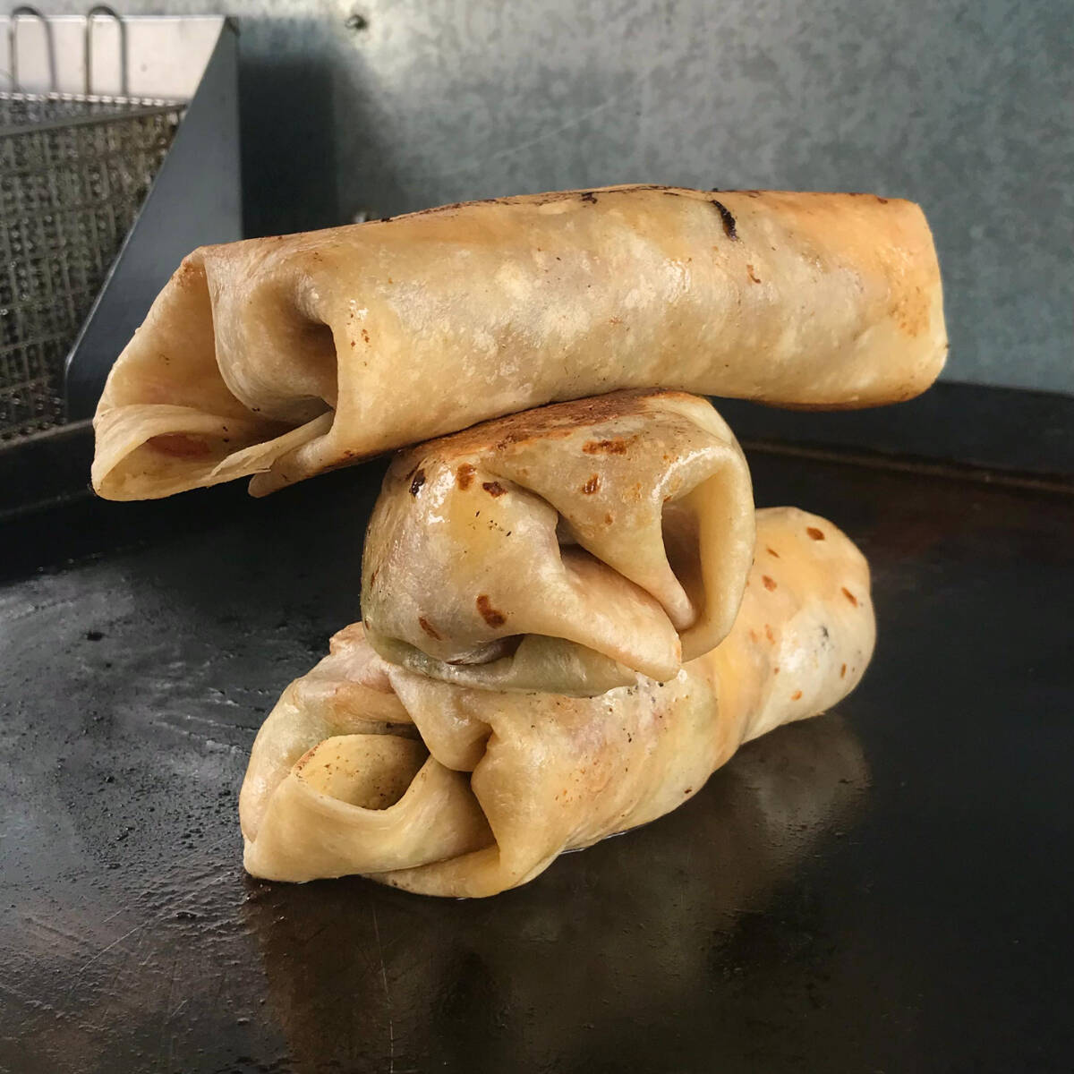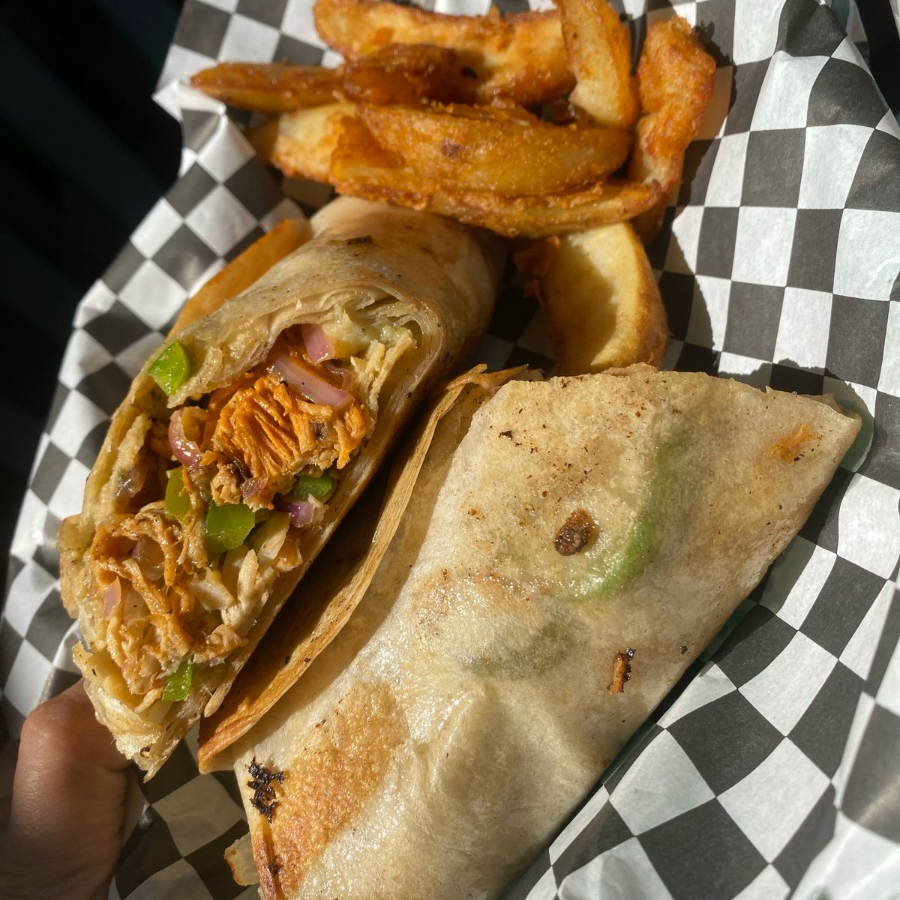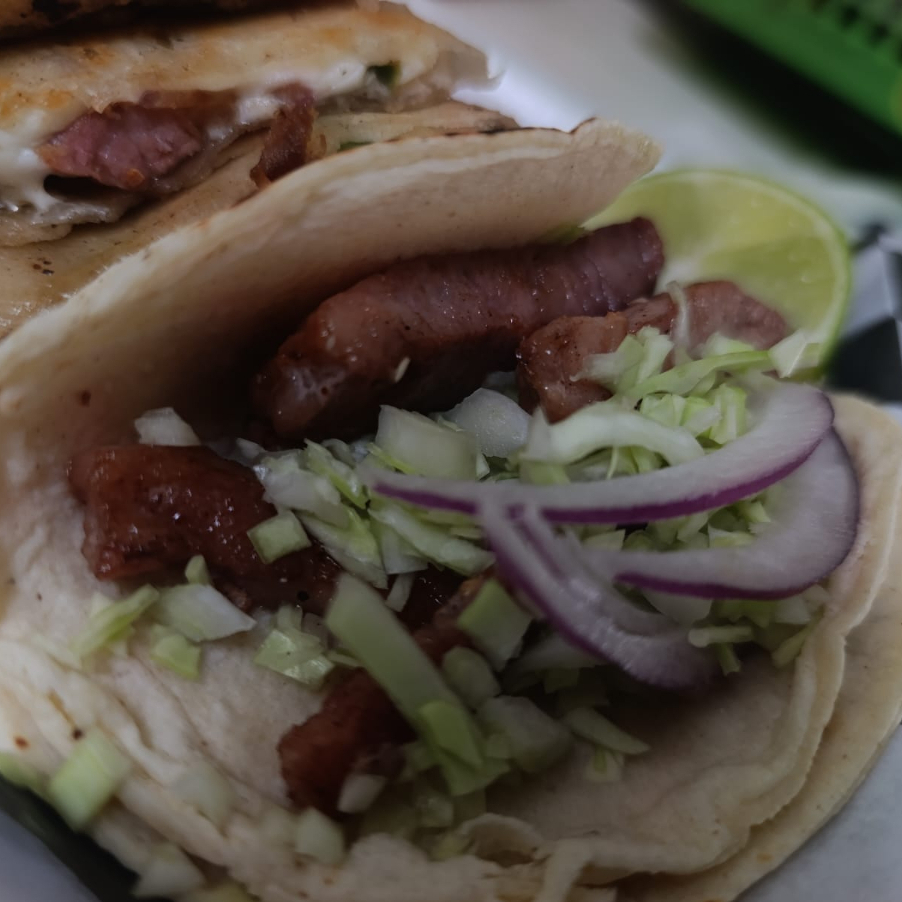 Tortilla, proteína (pollo, lechón y picaña), cebolla, queso y guacamole.