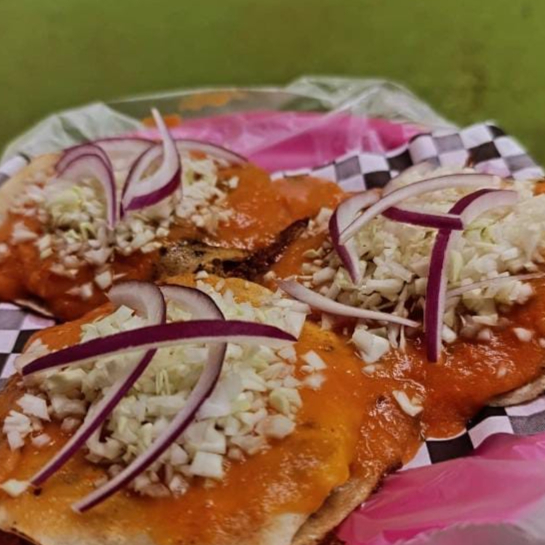 Bolillo, proteína, chilaquiles, crema, queso, coronados con cebolla y cilantro.