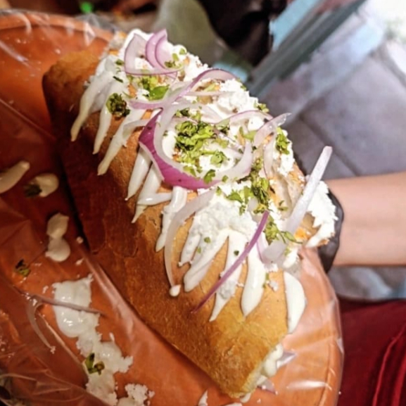 Bolillo, puerquito echado, ahogada en salsa de la casa, con repollo y cebolla