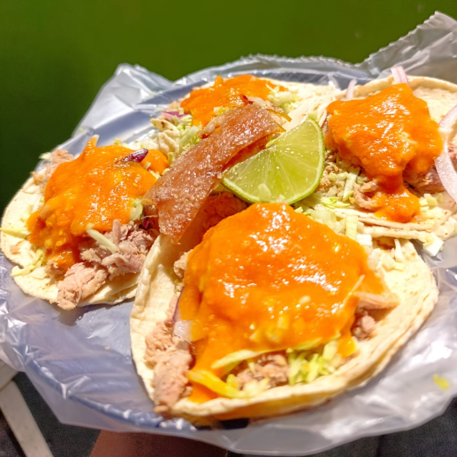 Totopos crujientes con lechón al estilo casero, salsa, crema y queso.