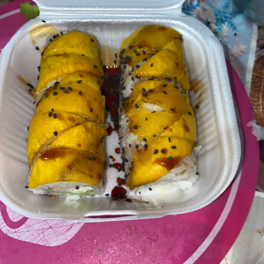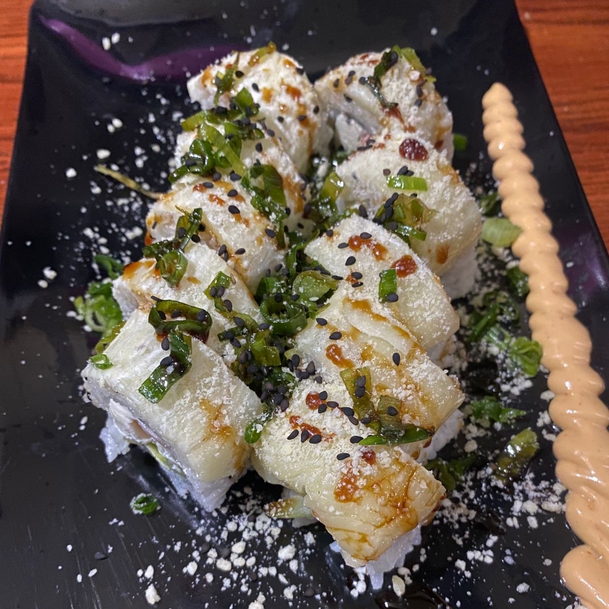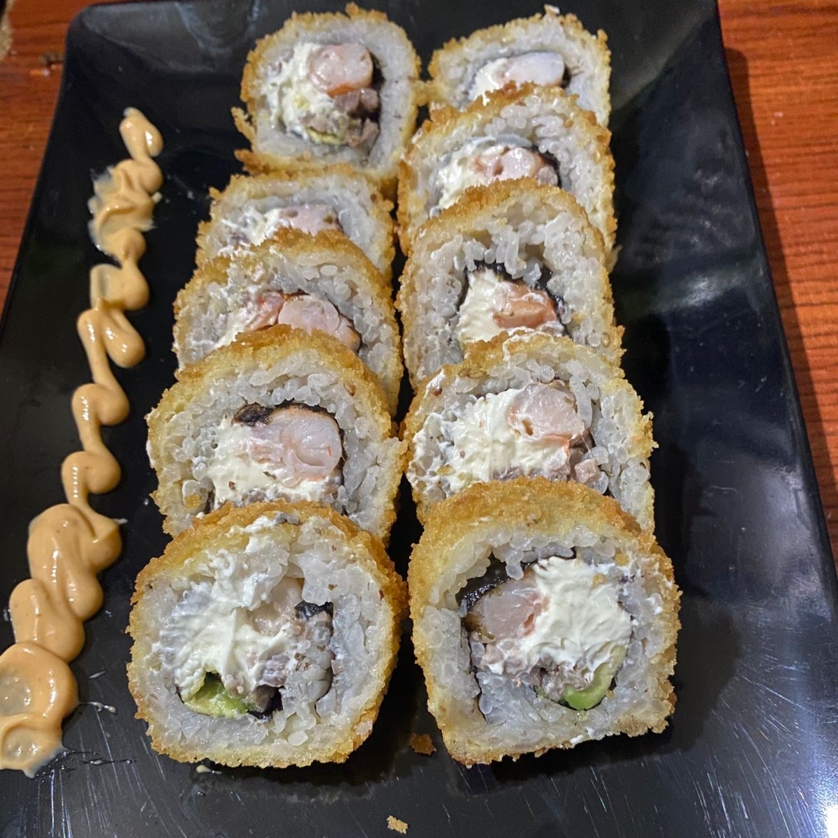 Natural- camarón tempura, aguacate y queso crema (f) coronado con plátano frito bañado en salsa anguila