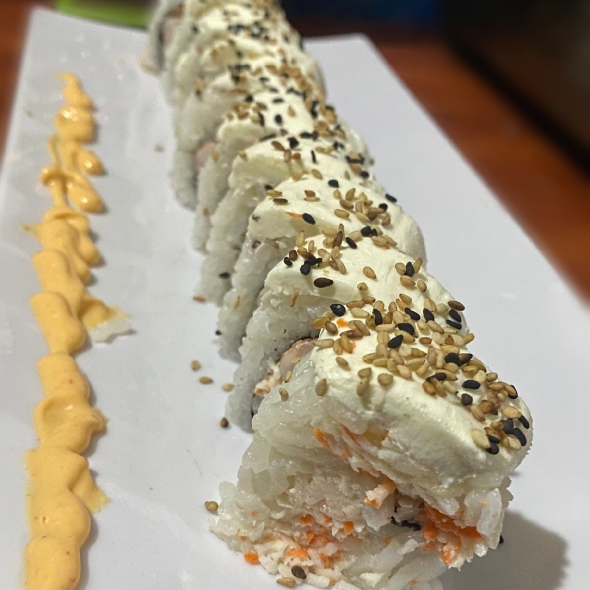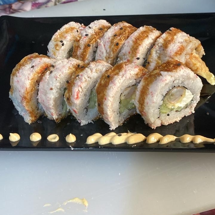 Empanizado- camarón tempura, aguacate y queso crema (f)coronado con surimi bañado en salsa anguila