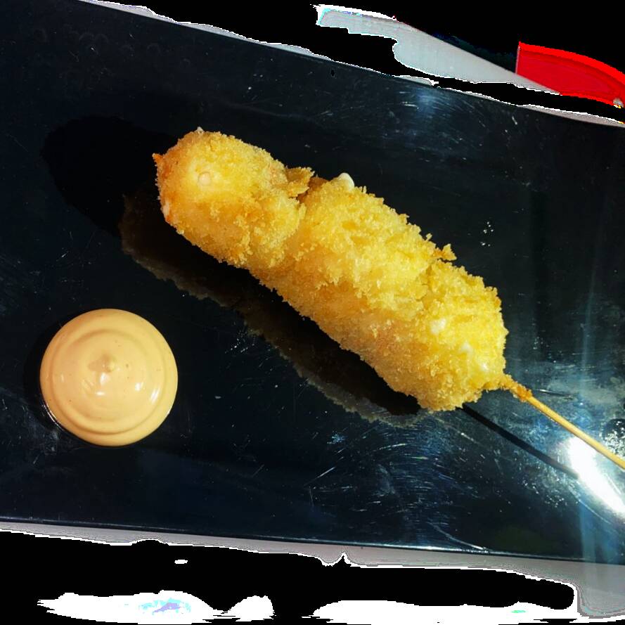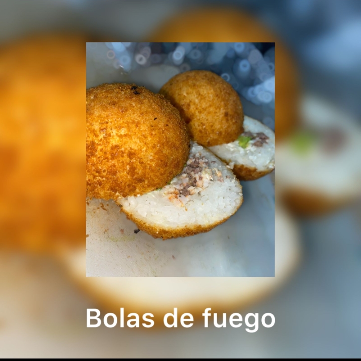 2 pz de bolas de arroz empanizadas rellenas de queso crema, aguacate, carne de res y camarón cocido