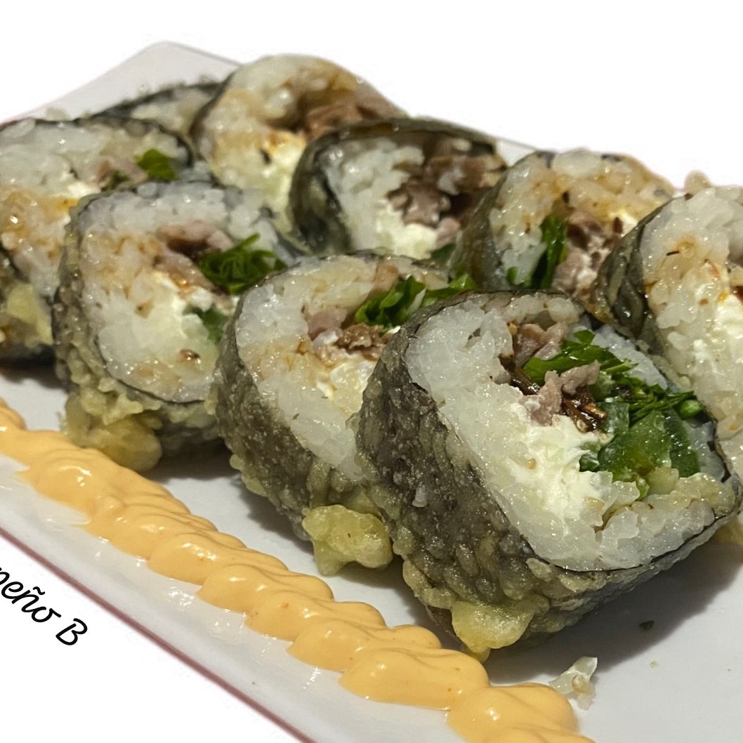 Tempurizado- (d) carne de res, cebollita finita, queso crema, chile jalapeño y cilantro