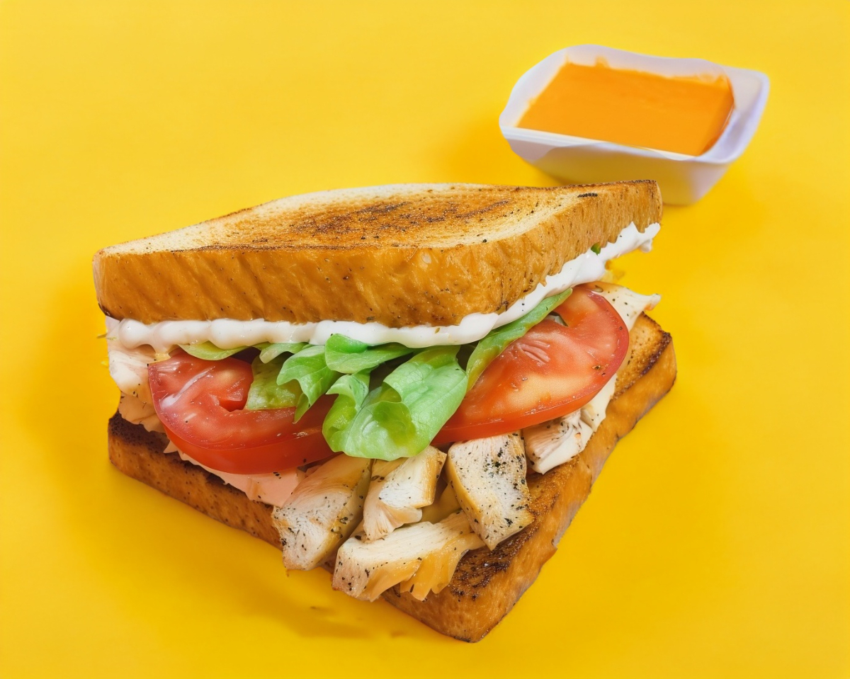 Pan integral o blanco relleno de pollo a la plancha con vegetales.