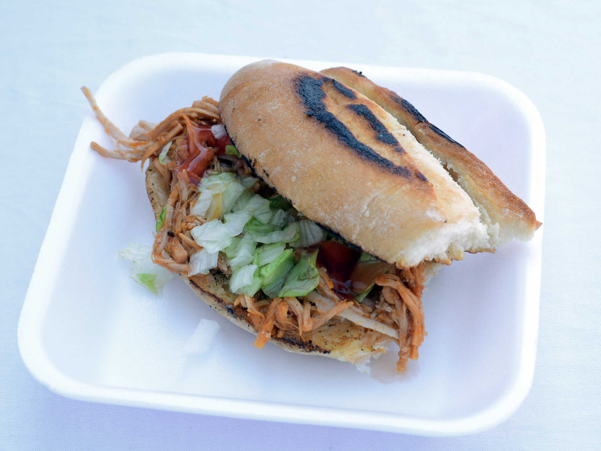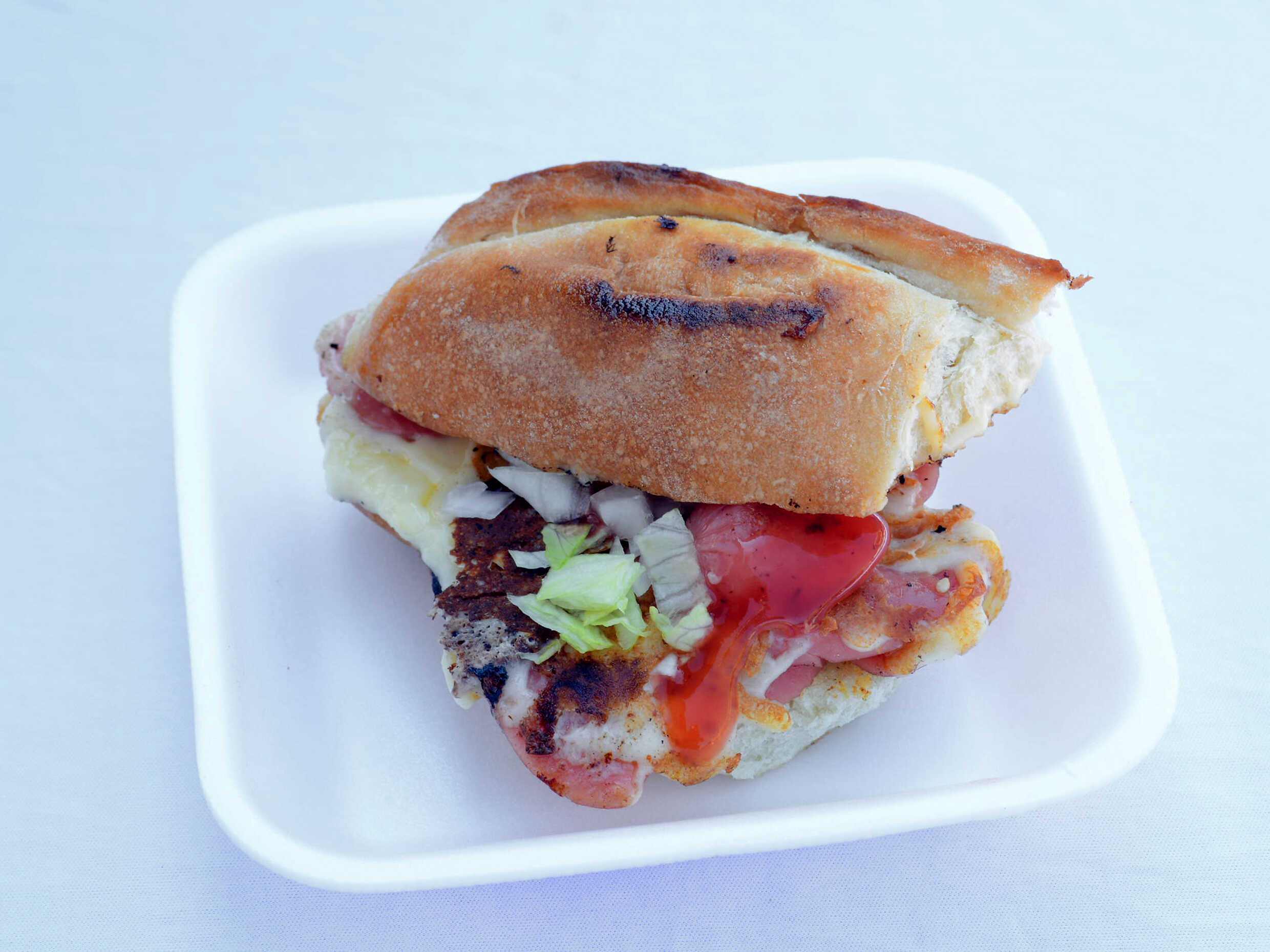 Pollo, lechuga, jitomate, cebolla, crema, cátsup y mostaza.