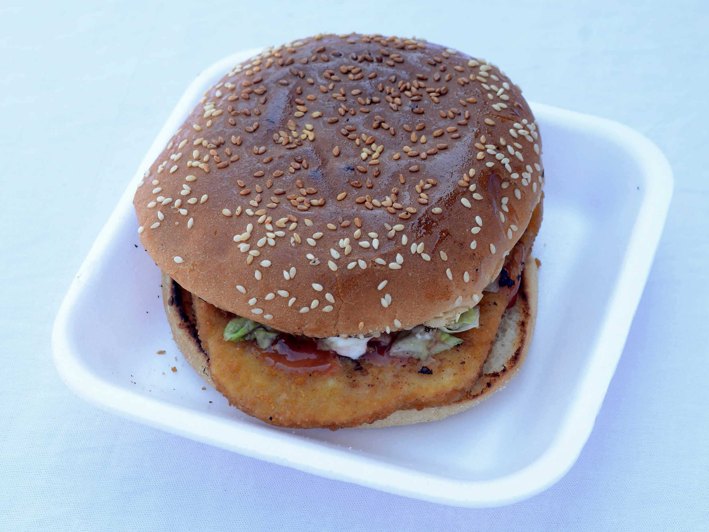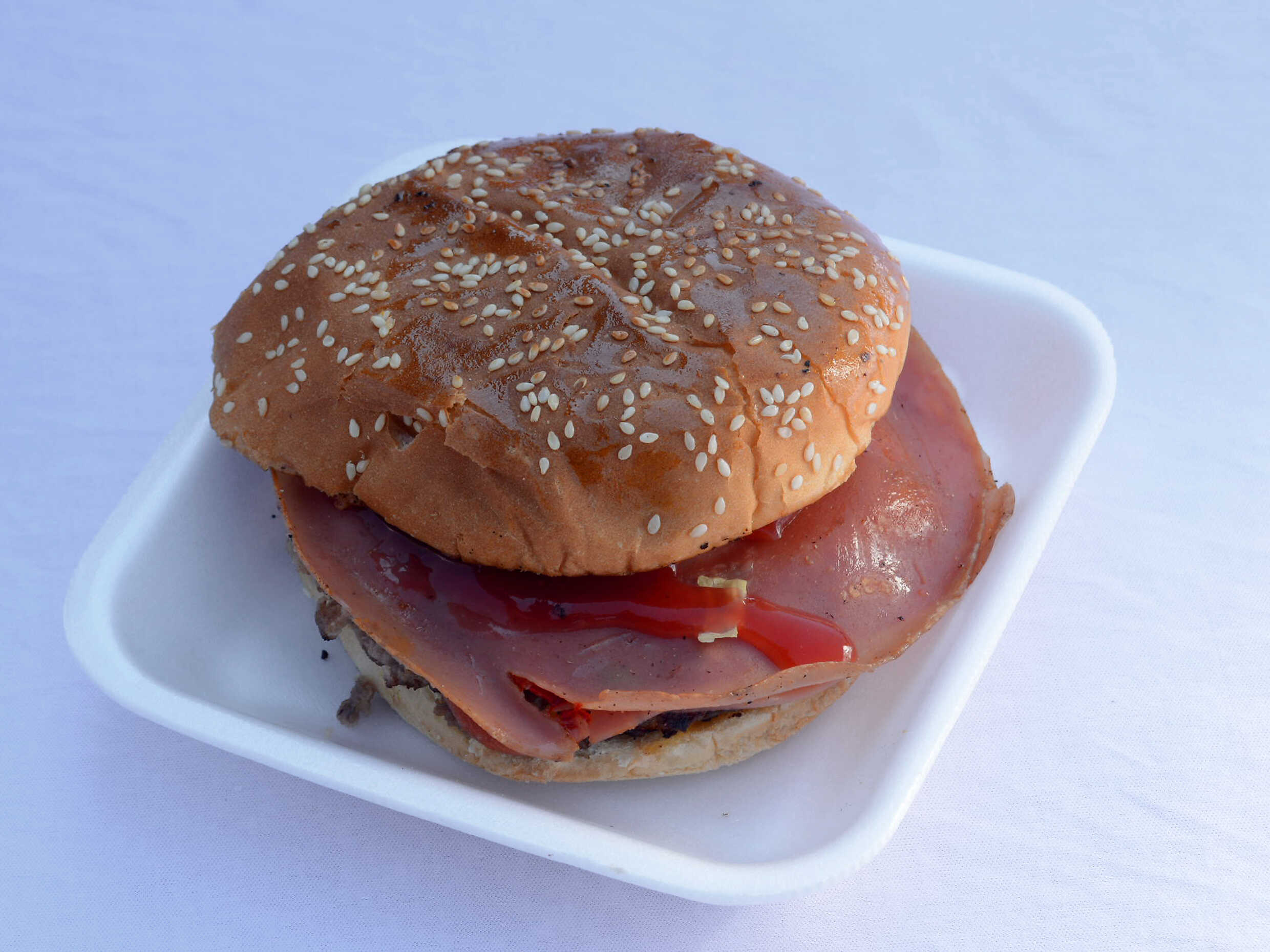 Carne, queso asadero, lechuga, jitomate, cebolla, cátsup, crema y mostaza.