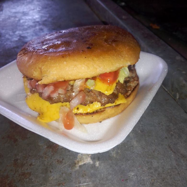 2 Carnes, 2 quesos amarillos, lechuga, jitomate, cebolla, cátsup, crema y mostaza.