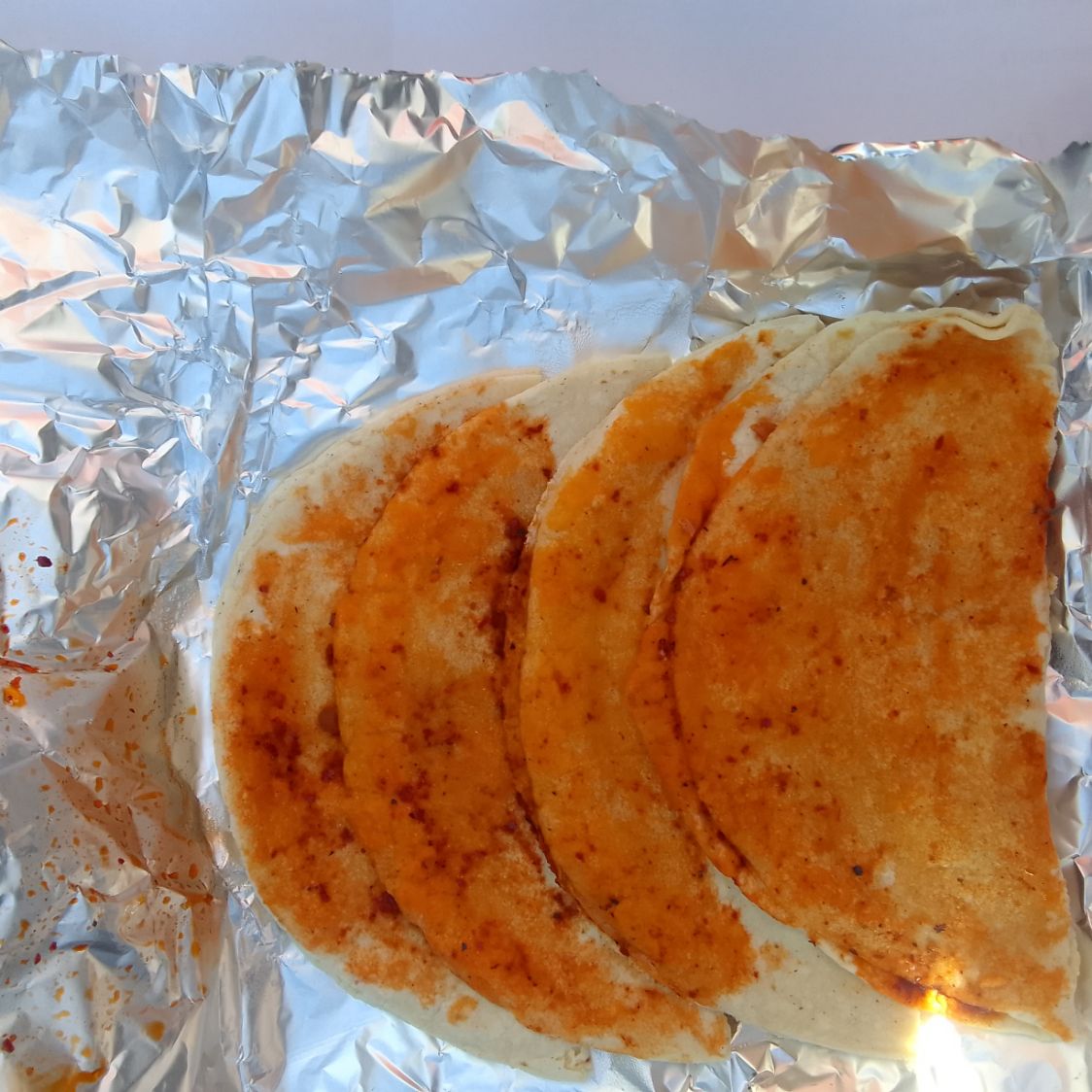 2 tacos de chicharrón, 1 taco de frijoles y 1 taco papa