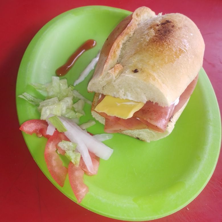 Jamón, queso amarillo, queso asadero, lechuga, cebolla, jitomate y cátsup.