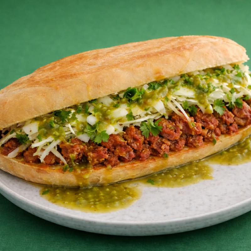 Preparada con Chorizo casero, repollo, cilantro, cebolla, salsa suave verde y chile rojo.