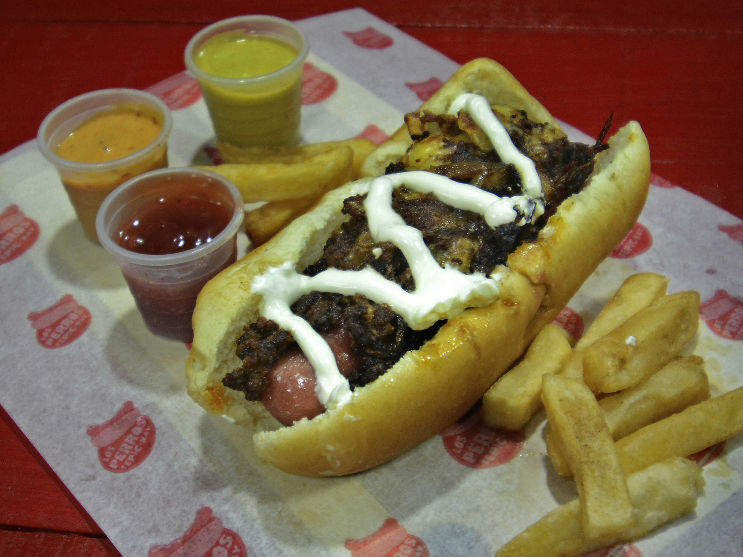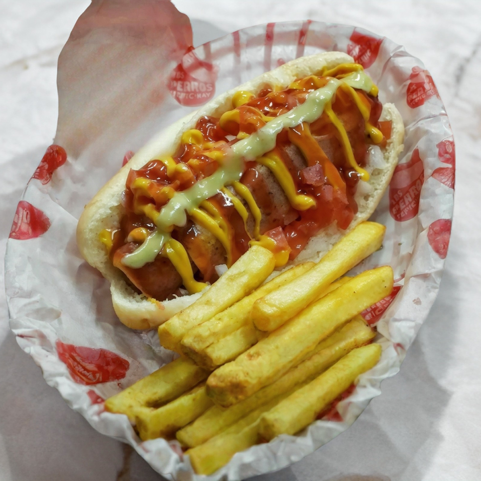 Orden de papas de 300 gr. con 3 salchichas picadas y aderezos.