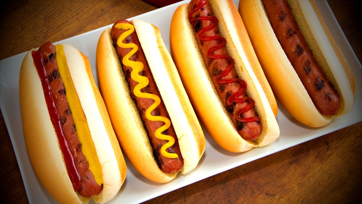 Salchicha, tocino, vegetales y aderezo.