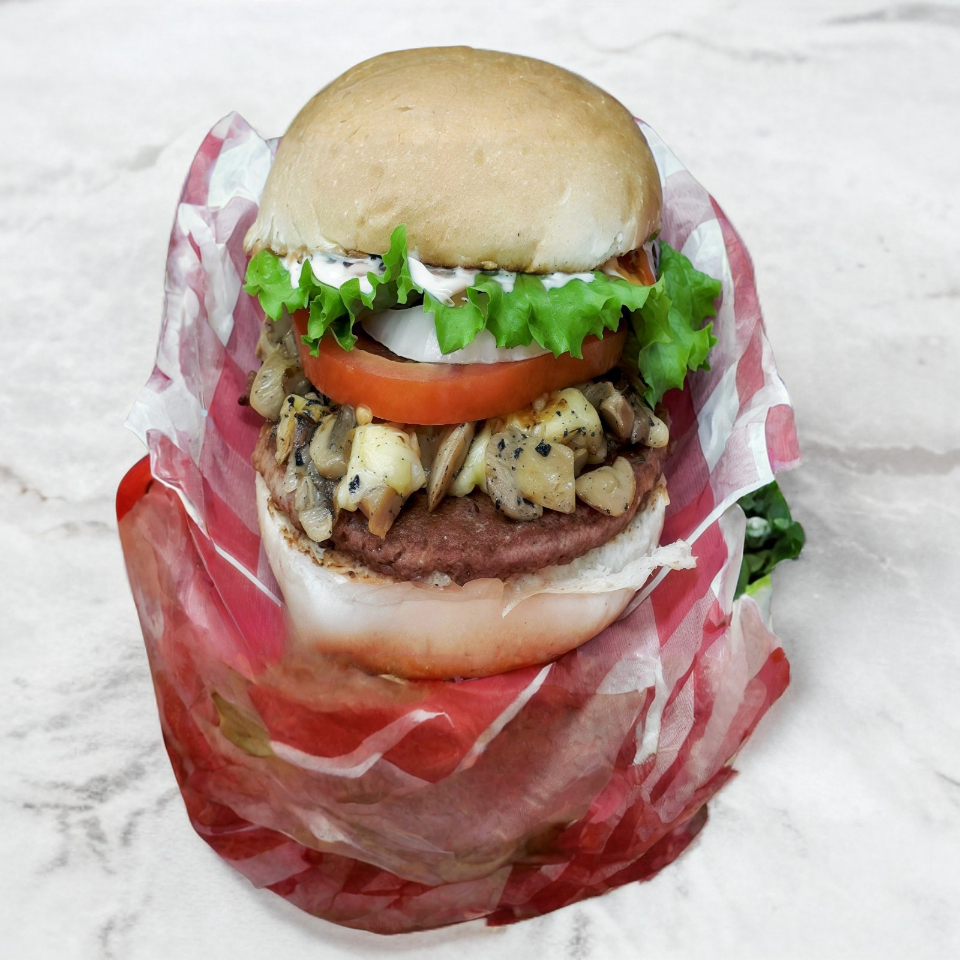 Clásica,Carne res 100 % (Jitomate ,cebolla ,lecuga )champiñones y queso asadero.