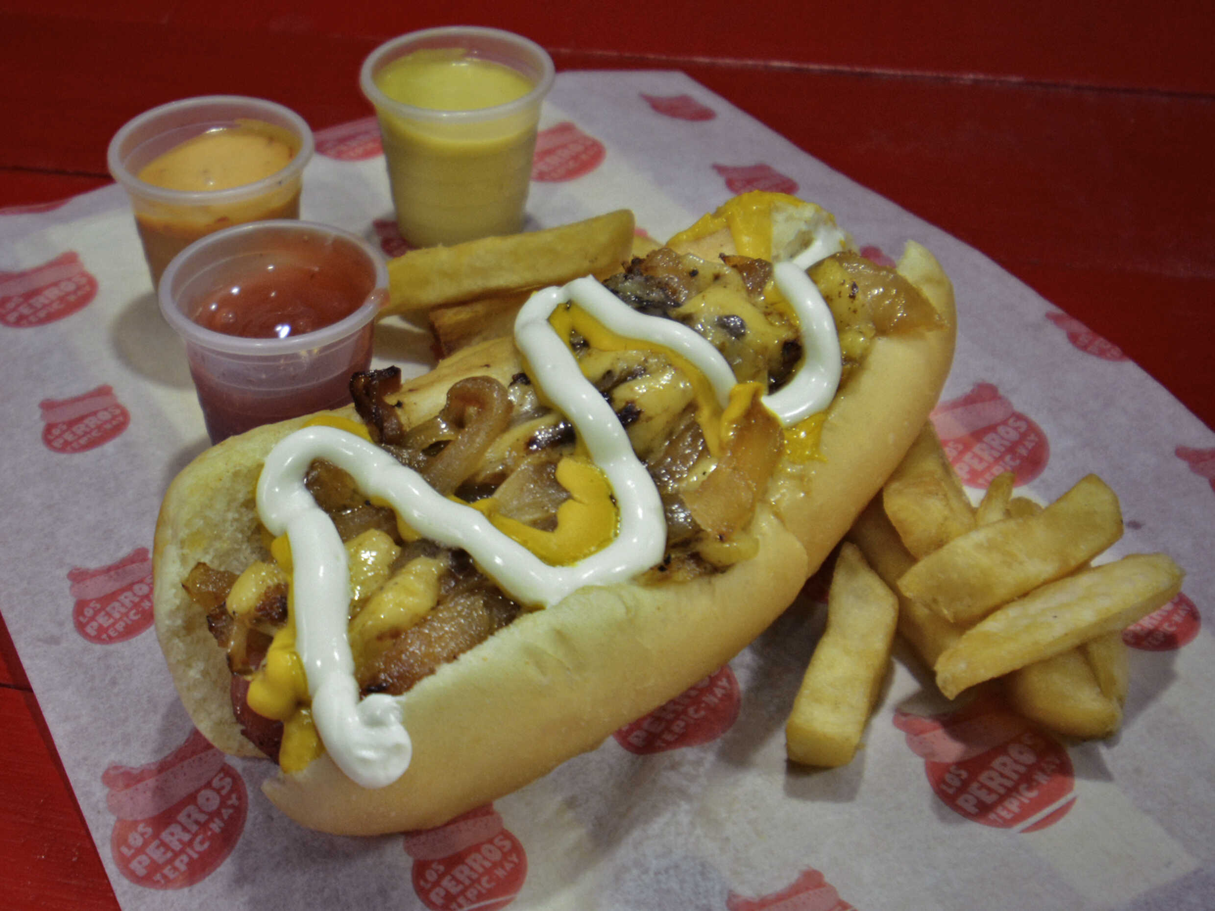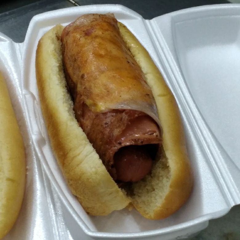 Hot dog de camarón, con queso asadero y cebolla asada debidamente sazonada y marinada, no lleva salchicha.