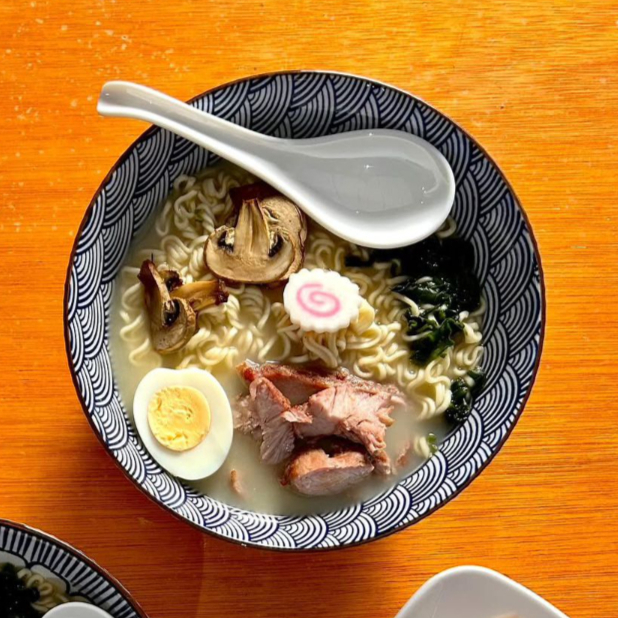 ramen con caldo tonkotsu (soya) acompañado de 100gr de su proteina elegida, cebollin, champiñones, huevo cocido y alga nori.