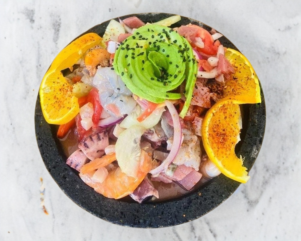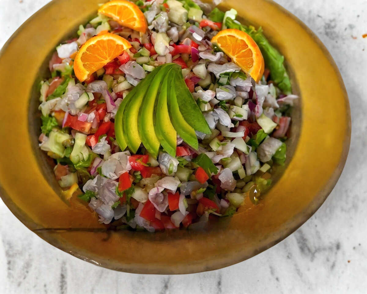 Camarón cocido y curtido en limón. Acompañado de jitomate, cebolla y pepino, decorado con naranja y un abanico de aguacate.