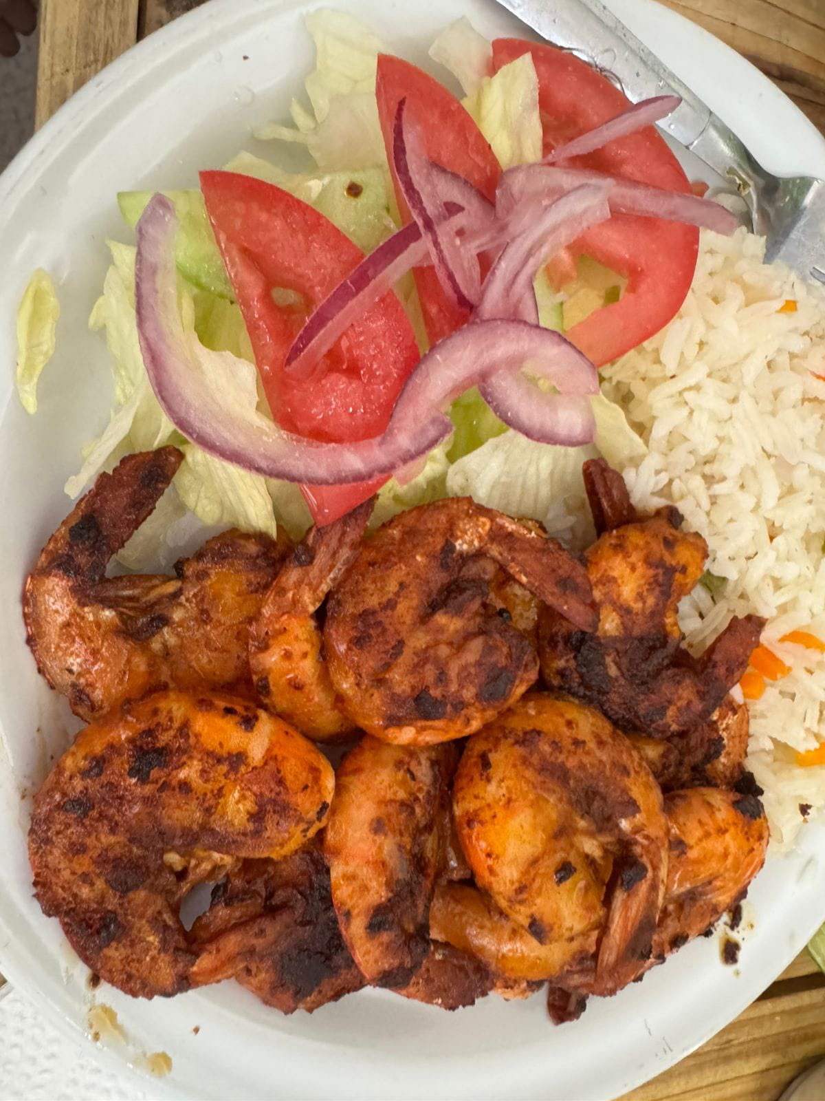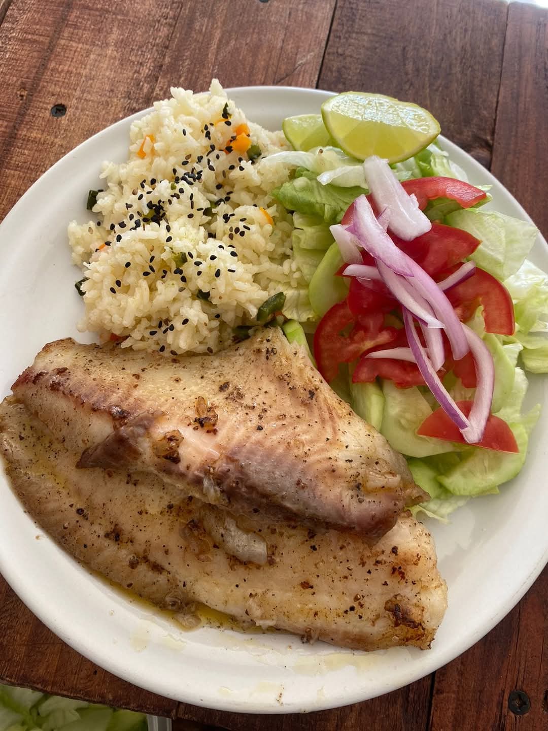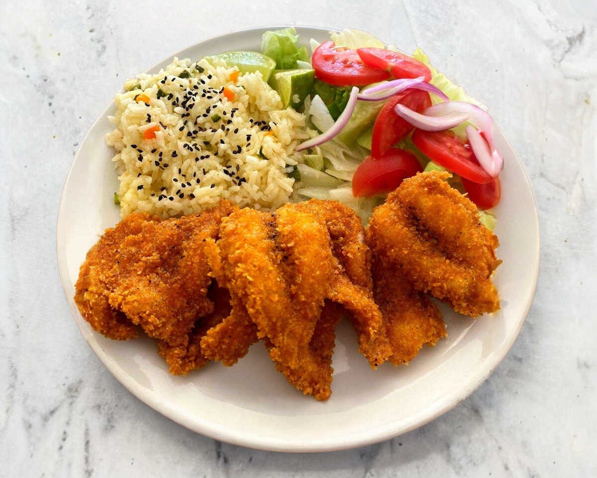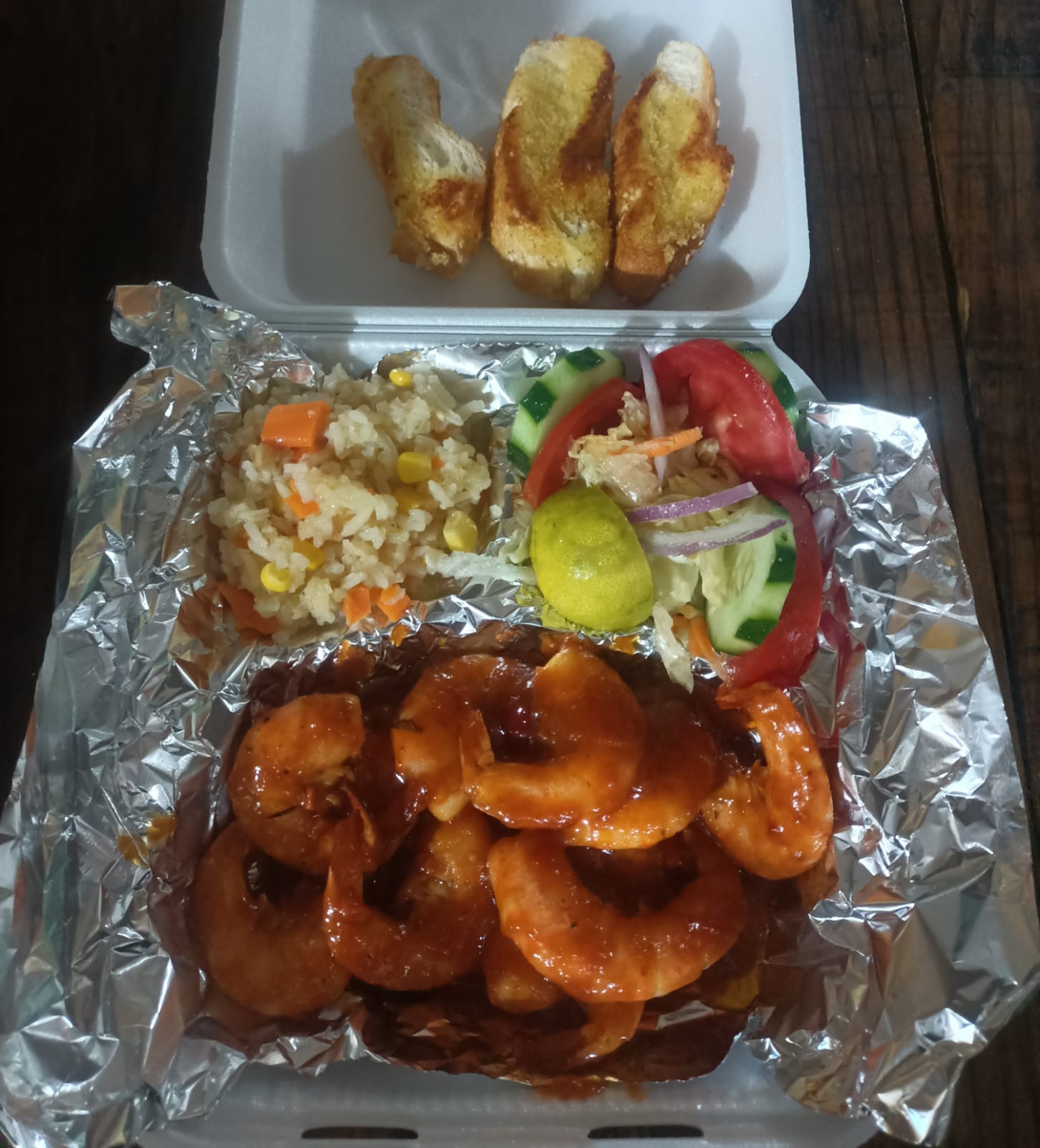 Con guarnición de arroz, ensalada y dos rebanadas de pan con mantequilla y ajo.