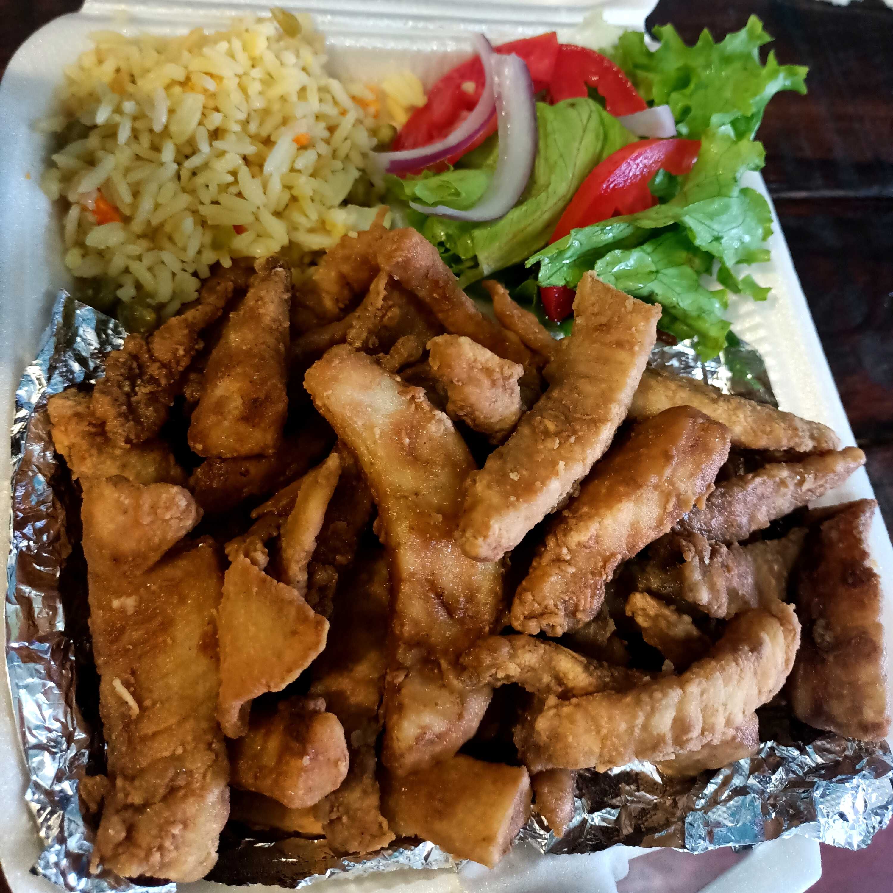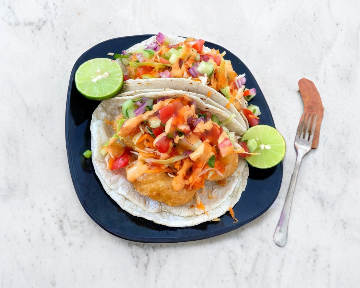 Taco de Pescado Capeado 3 Piezas Con una tortilla de maíz (tipo 10 a 12cm). ensalada de chile jitomate cebolla y pepino salsa picante y aderezo.