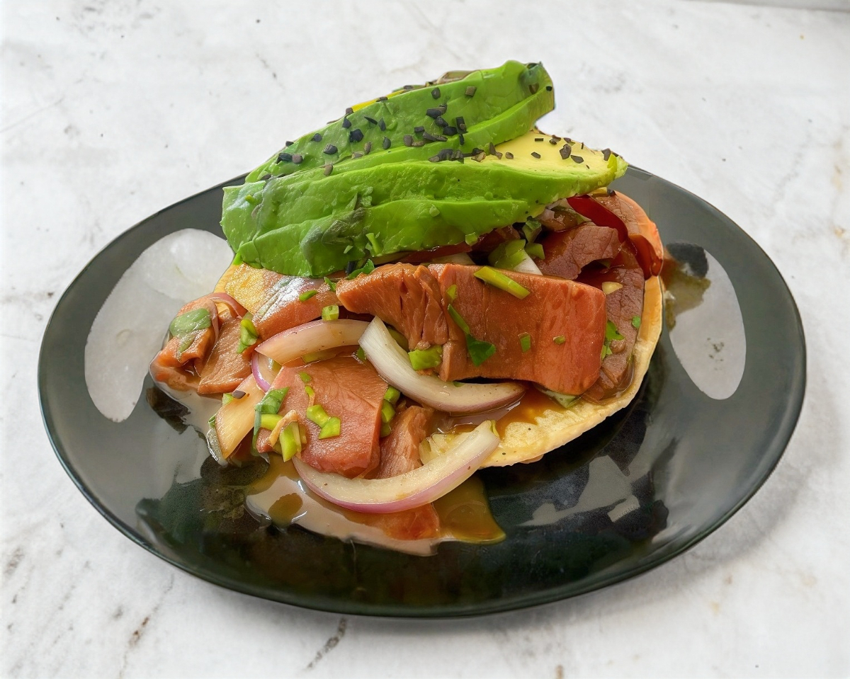 Medio Medallón de Atún, con pepino, cebolla, cilantro, 2 tostadas y decorado con mango y tajin