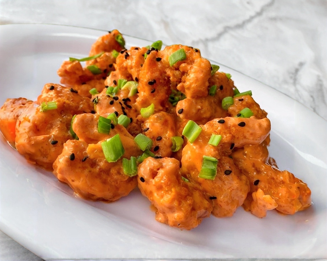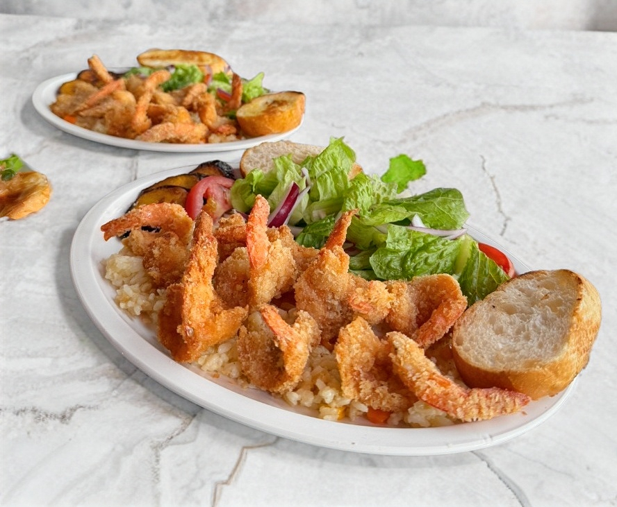 camarones bañados con aderezo de la casa acampados con ensalada y arroz