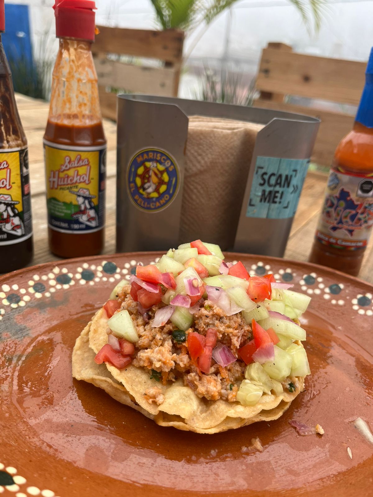 Tostada de camarón crudo con pepino, cebolla morada y jitomate