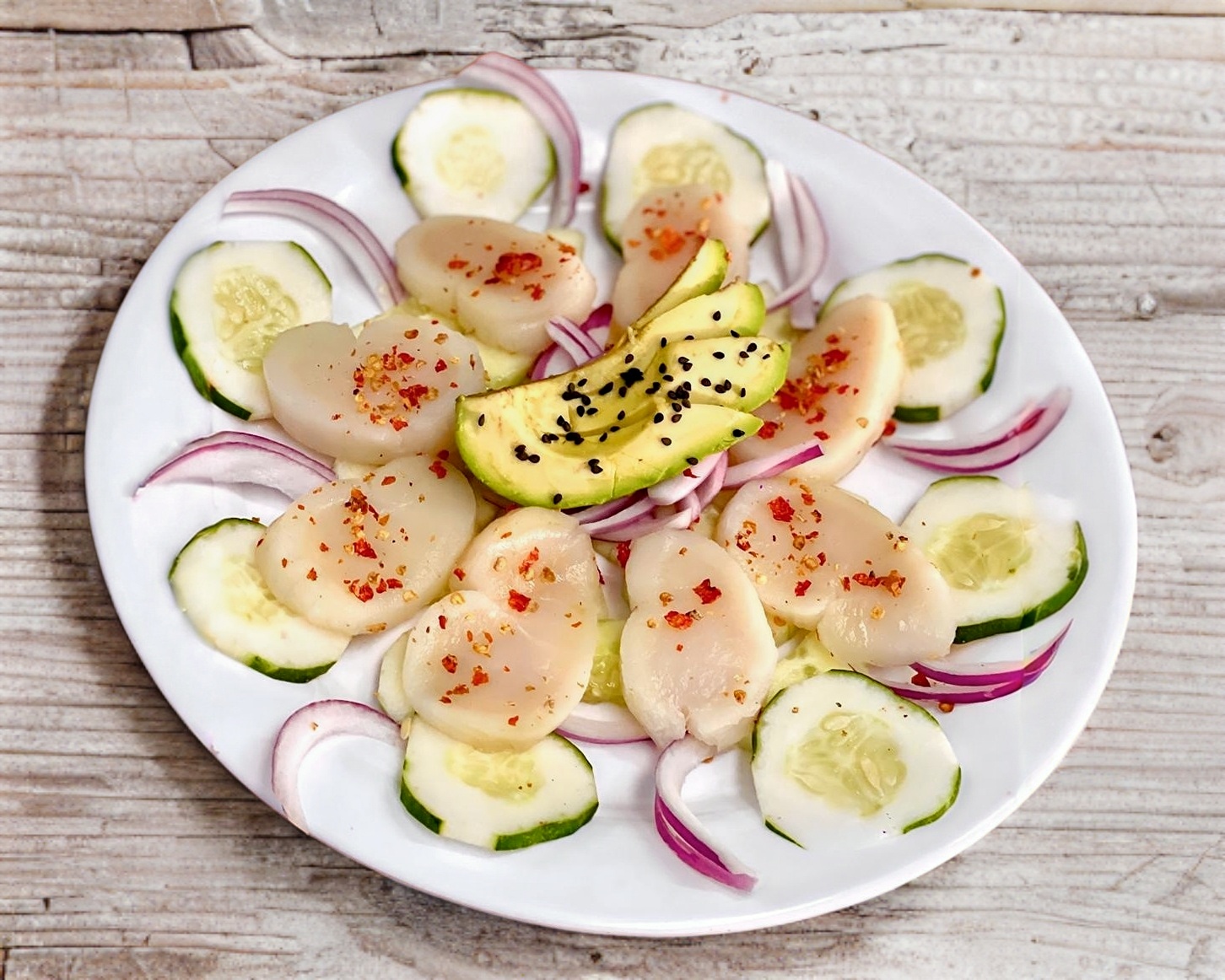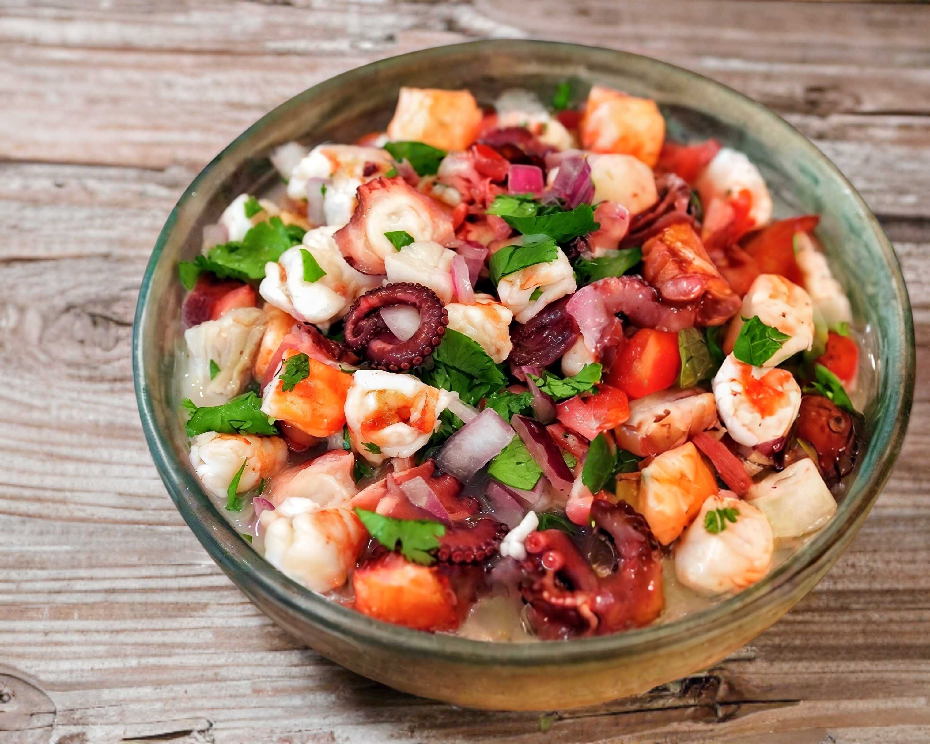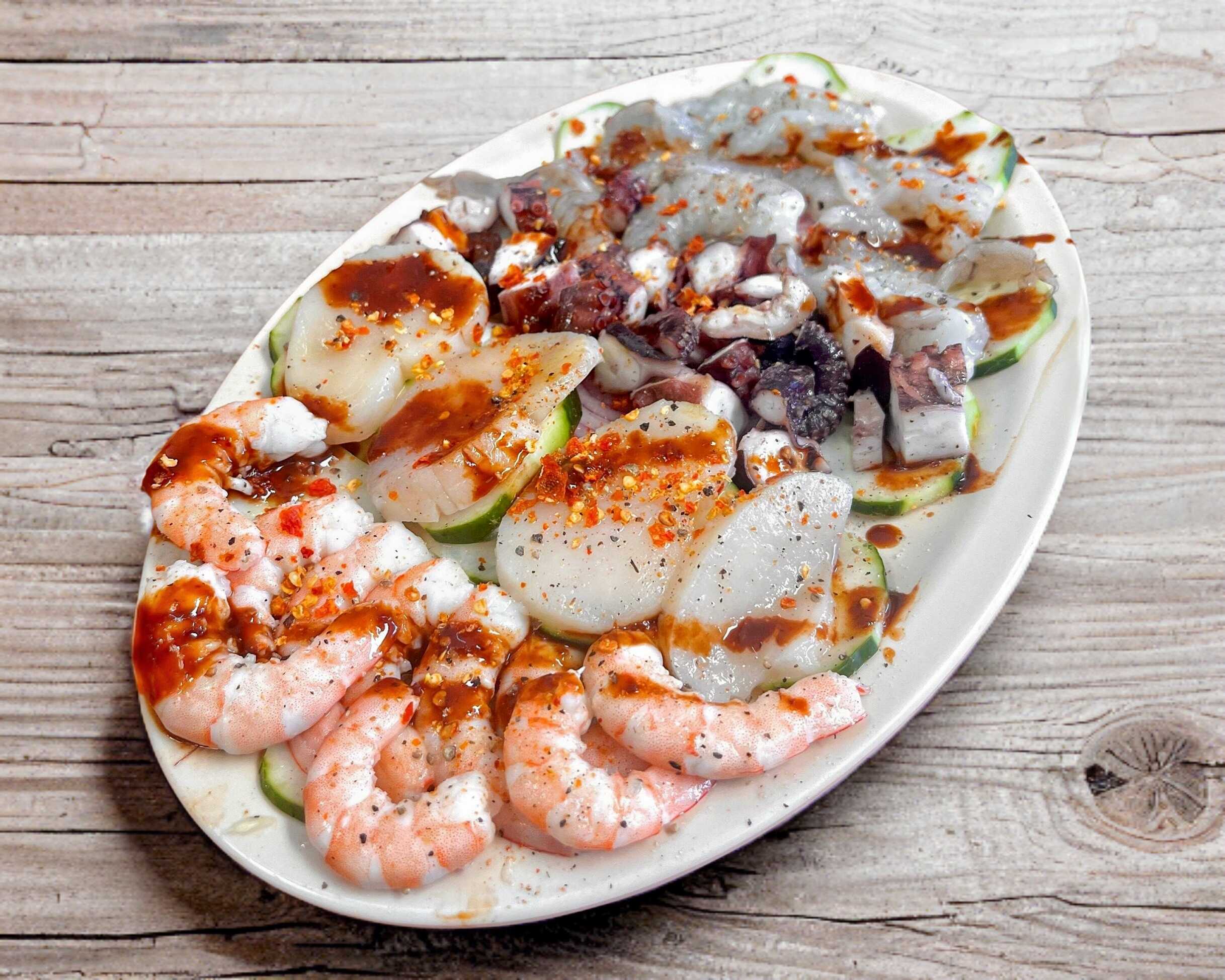 Camarón cocido, crudo, pulpo, callo acompañado de pepino, jitomate, cebolla, incluye tostadas.