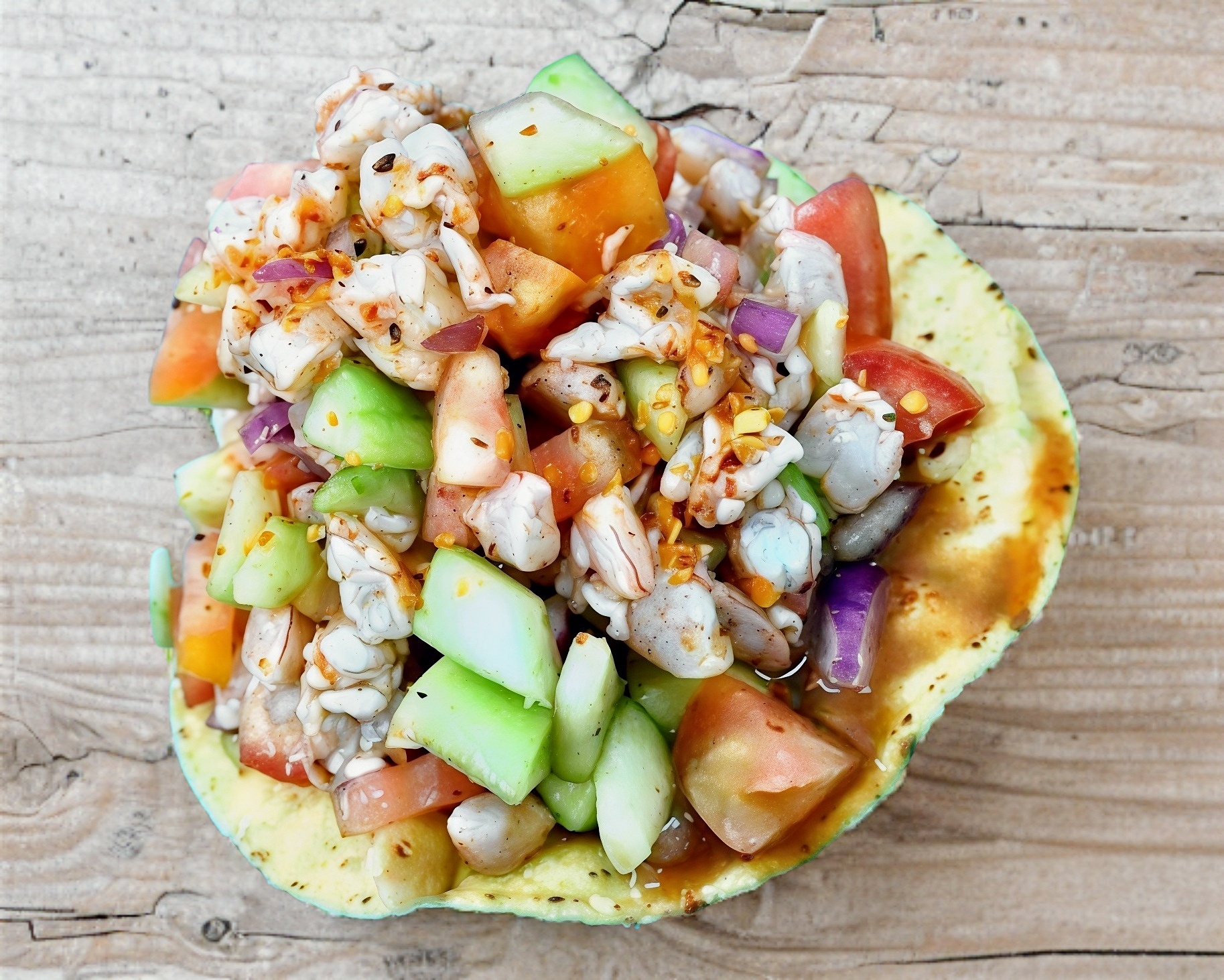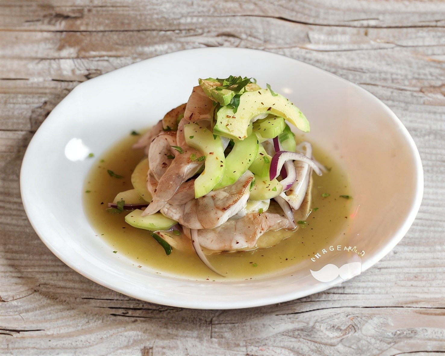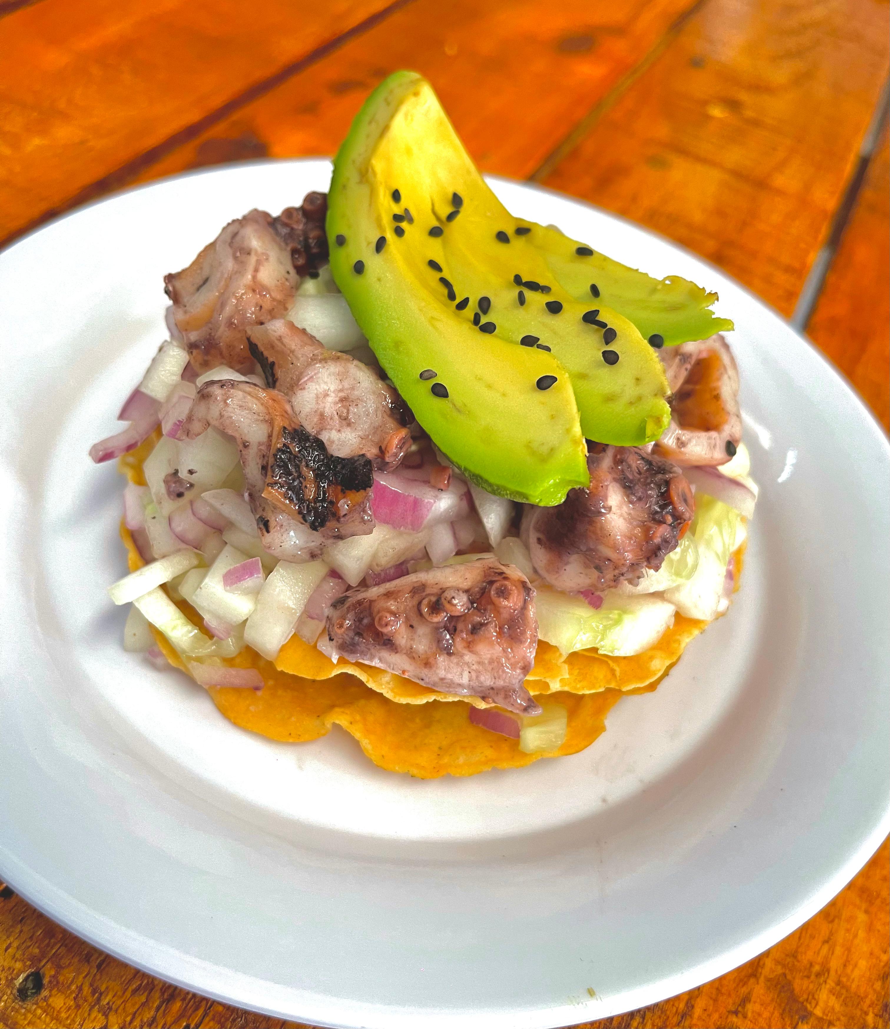 Pulpo acompañado de pepino, cebolla, jitomate y aguacate.