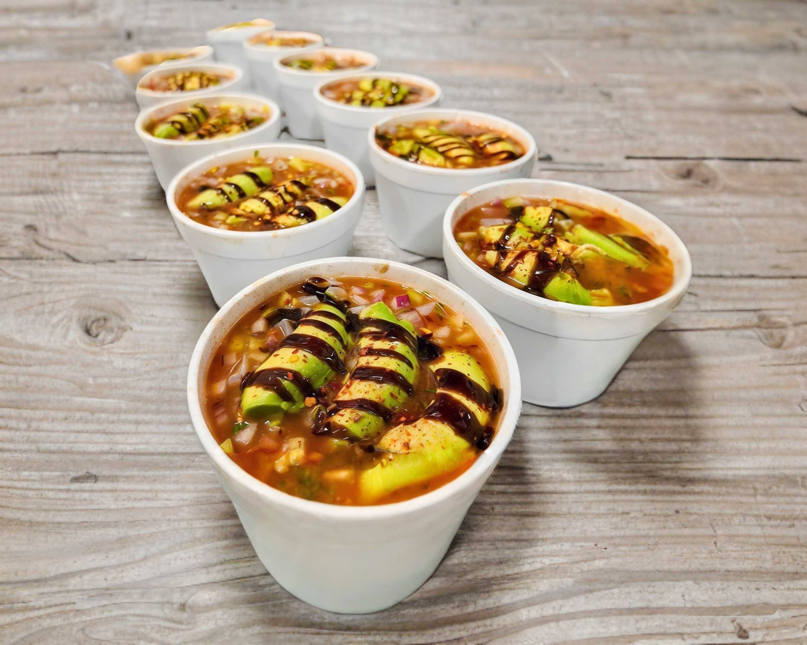 Cazuelitas calientes de consome con camaron cocido, acompañado de verdura 500 ml.