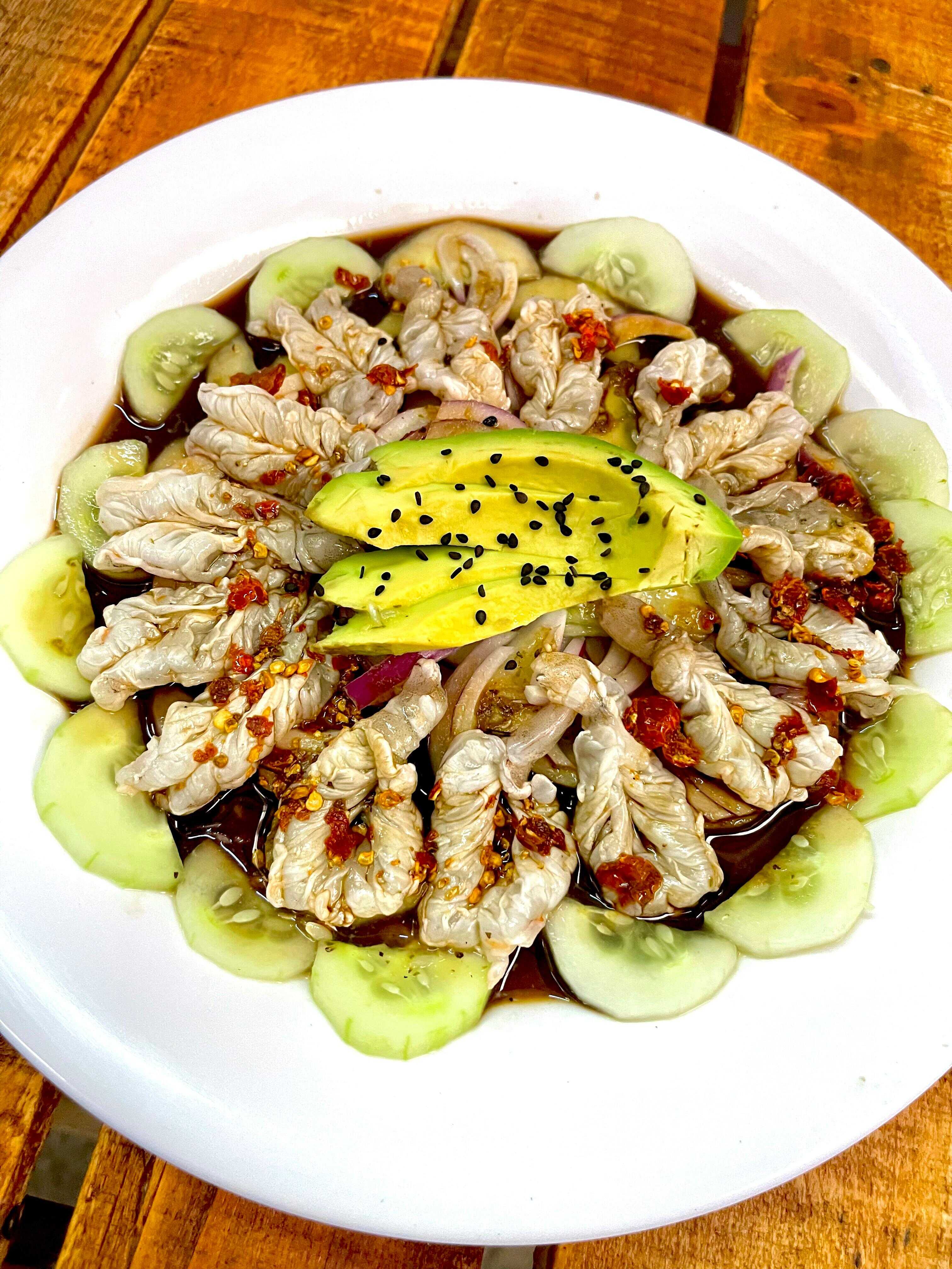 Callo de acha acompañado de pepino y cebolla en salsa chiltepin, incluye bolsa de totopos.