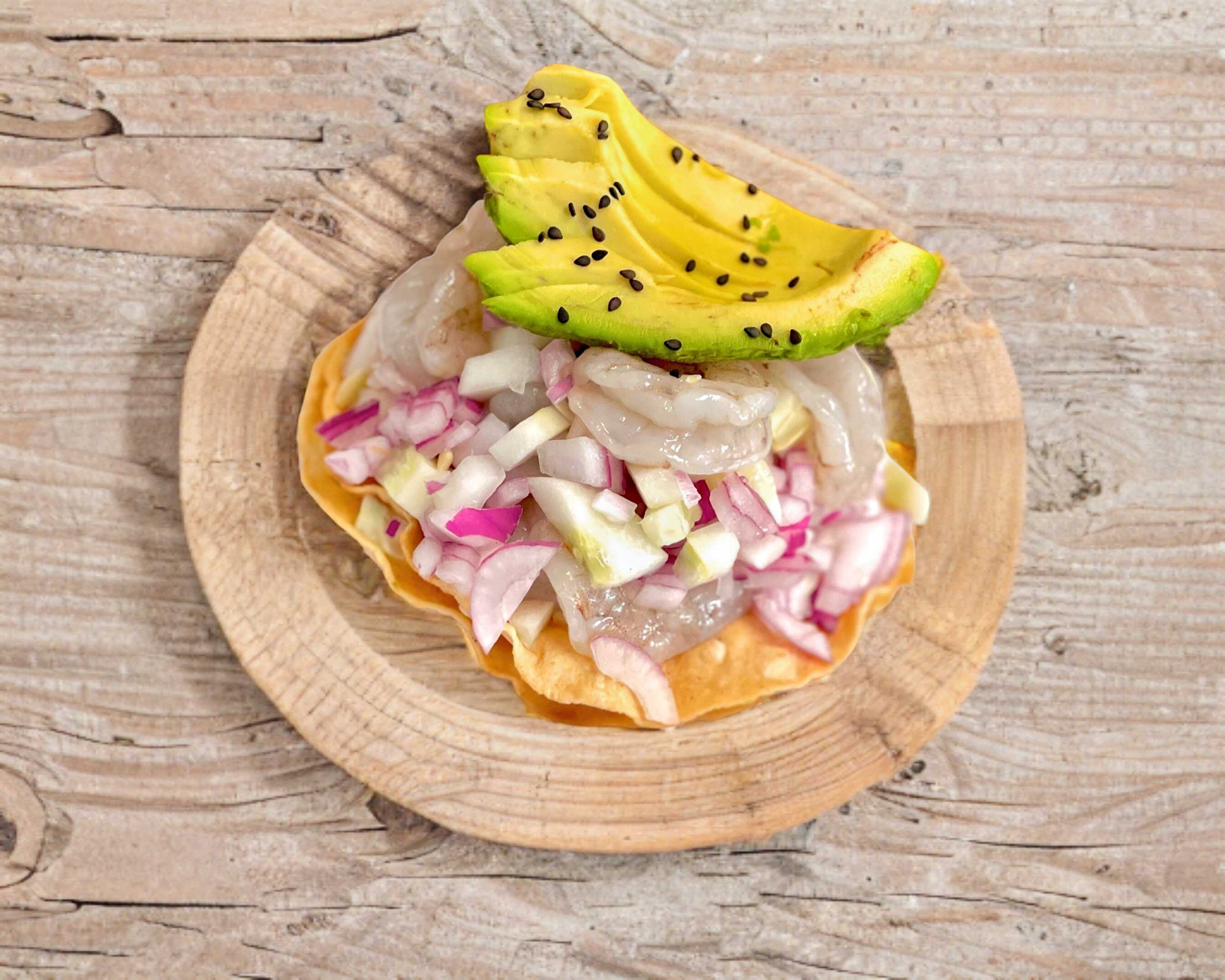 Camarón crudo o cocido, acompañado de pepino, jitomate, cebolla morada, incluye tostadas.
