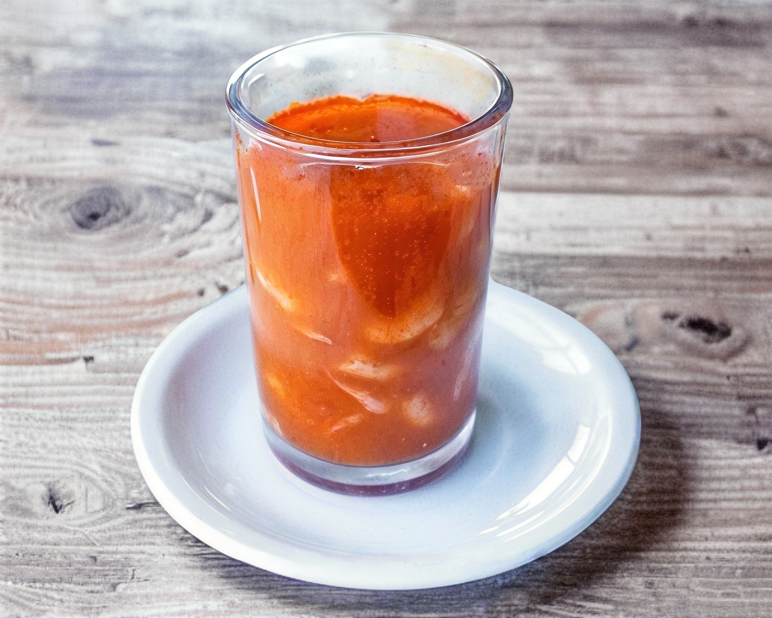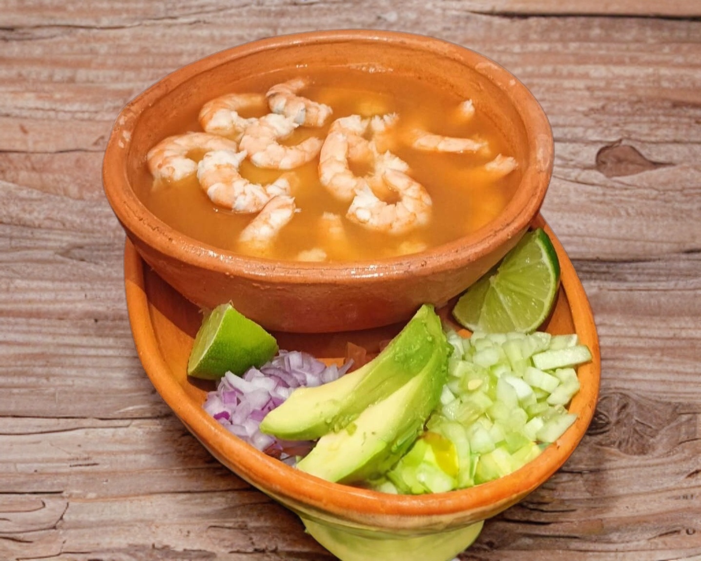 Consome de camarón 500 ml, acompañado de pepino, cebolla, y limón.