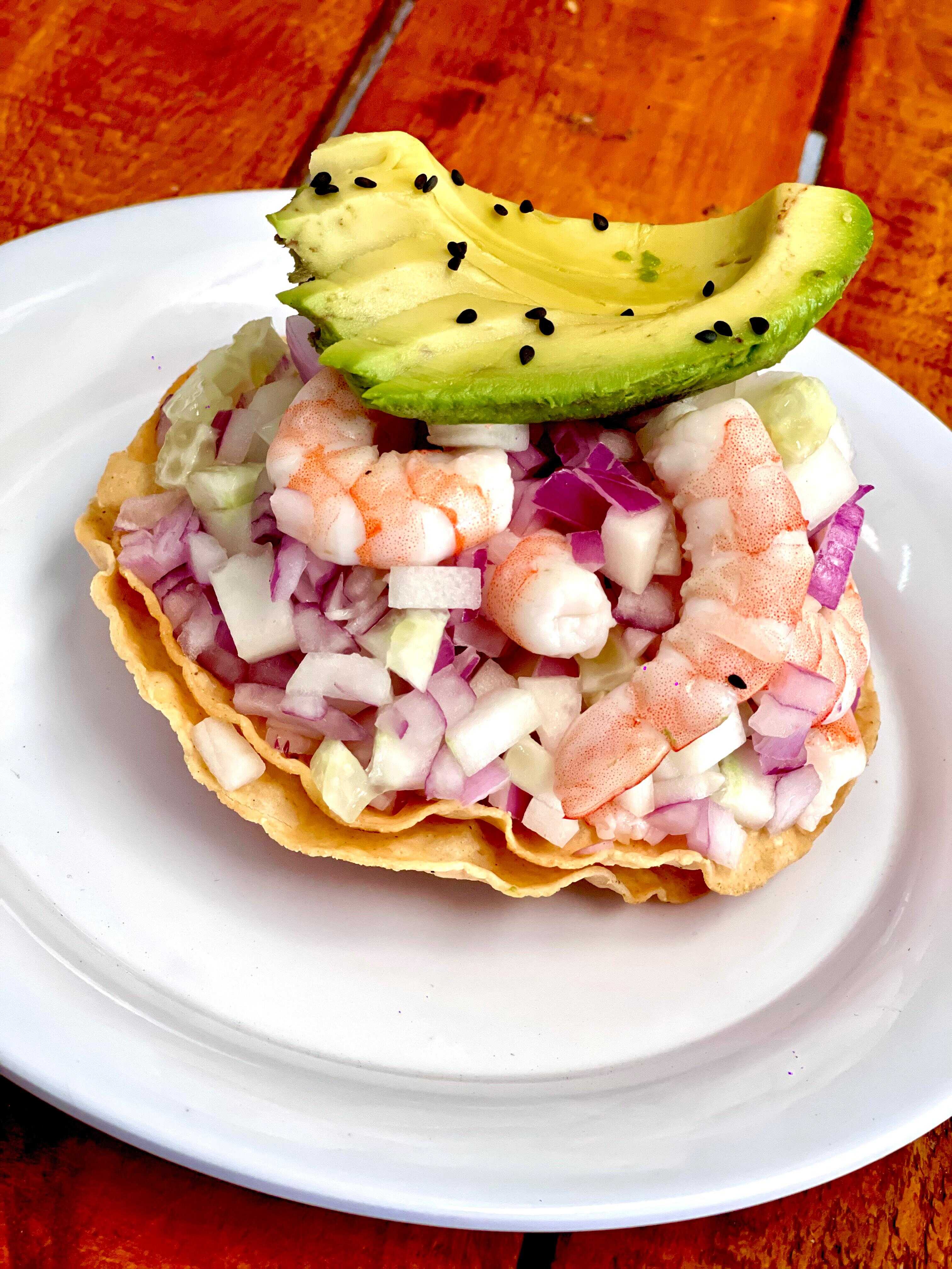 Ceviche de camarón estilo sinaloa incluye tostadas.