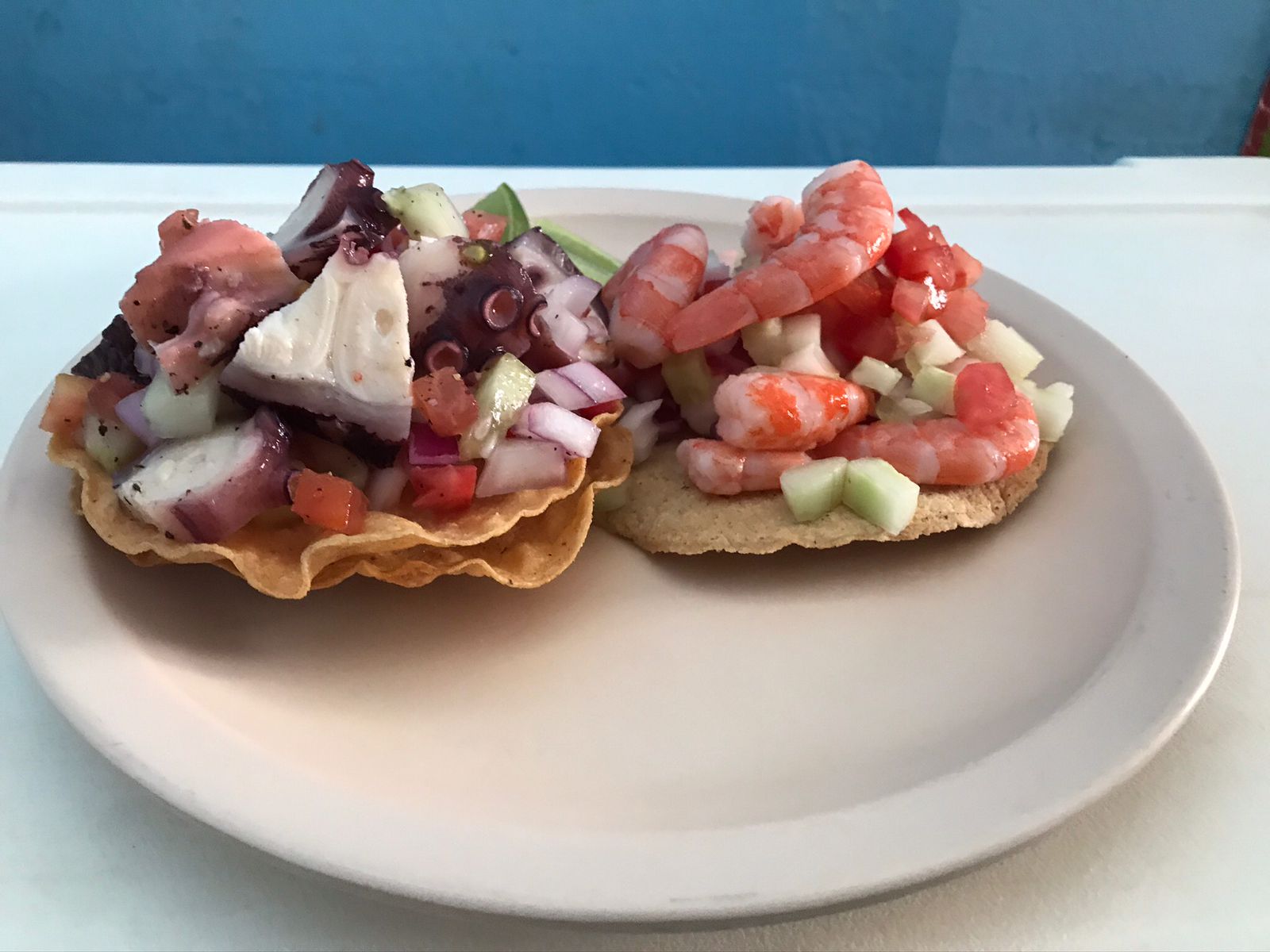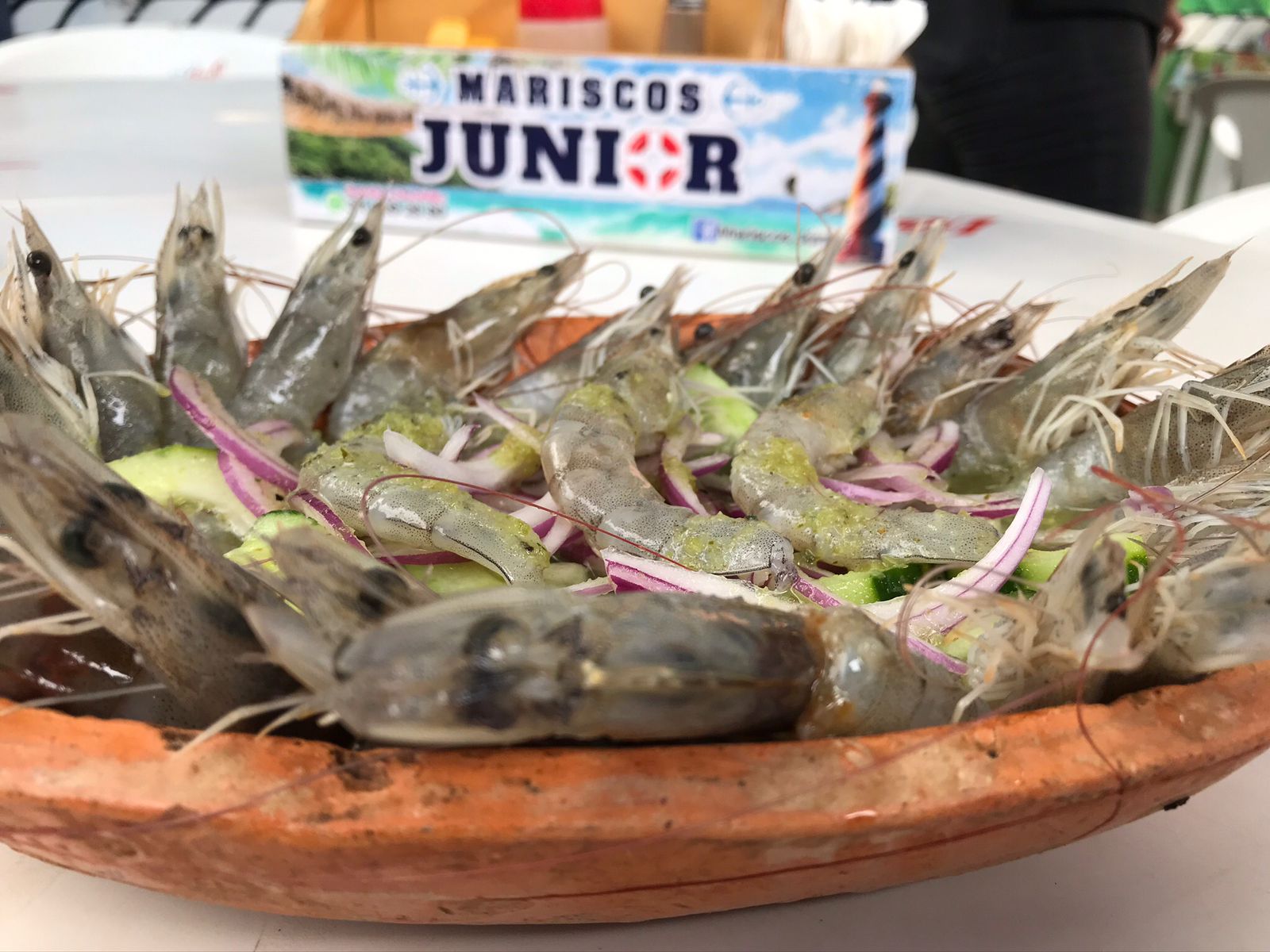 Camarón crudo, cocido y seco. Pulpo y ceviche de pescado.