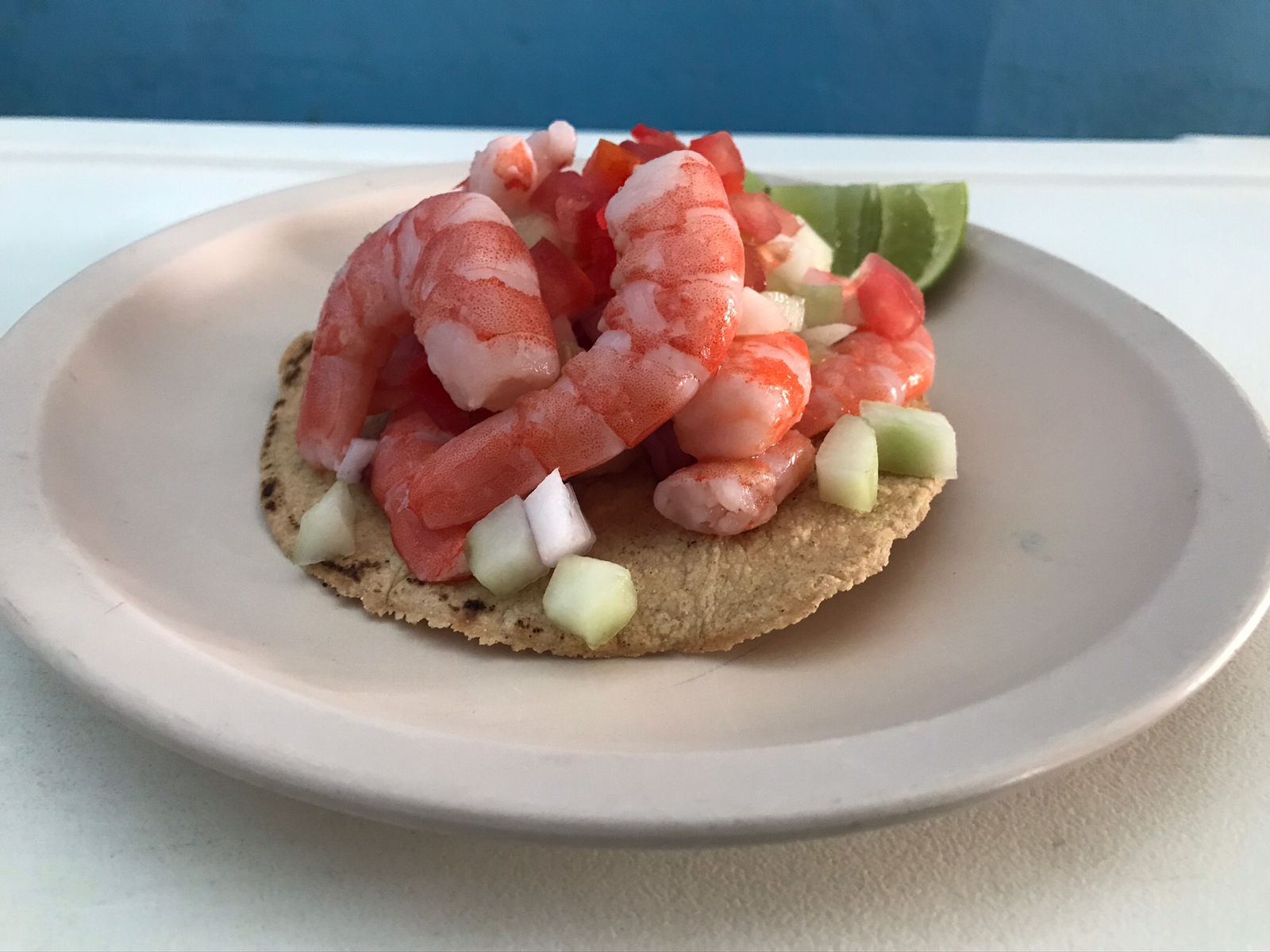 Pata de mula, camarón crudo, cebolla y salsa huichol.