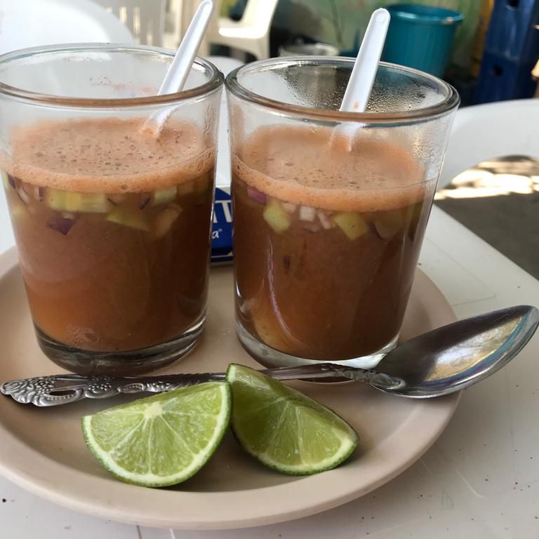 Camarón crudo, pepino, cebolla, jitomate, cilantro, piña, chile serrano, Clamato y salsa de la casa.