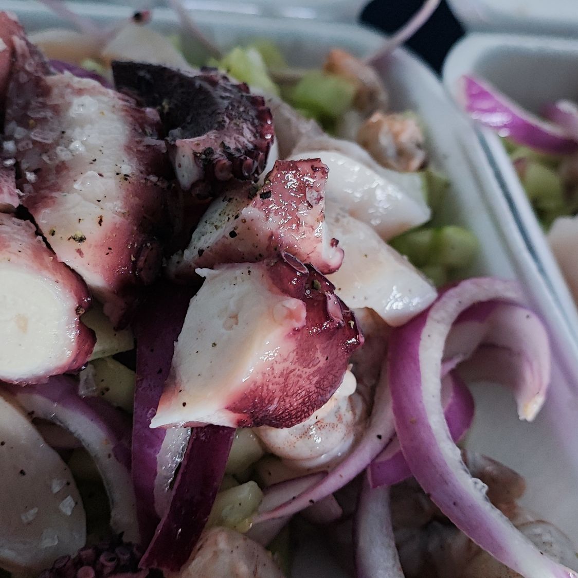 Calamar, pulpo, camarón cocido, ostión y pata de mula.