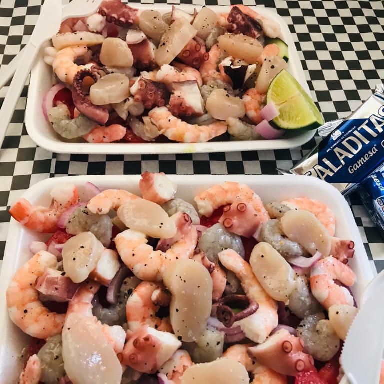 Exquisita ensalada de camarón cocido, pulpo y callo de hacha, acompañada de crujientes rebanadas de cebolla marinadas en una vibrante salsa chiltepín. Una combinación fresca y picante que deleita los sentidos. Disfrútala con una refrescante limonada grande, ¡de cortesía!