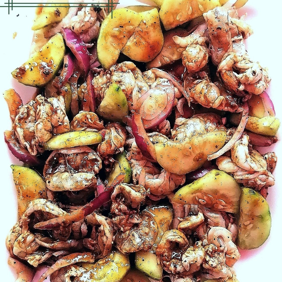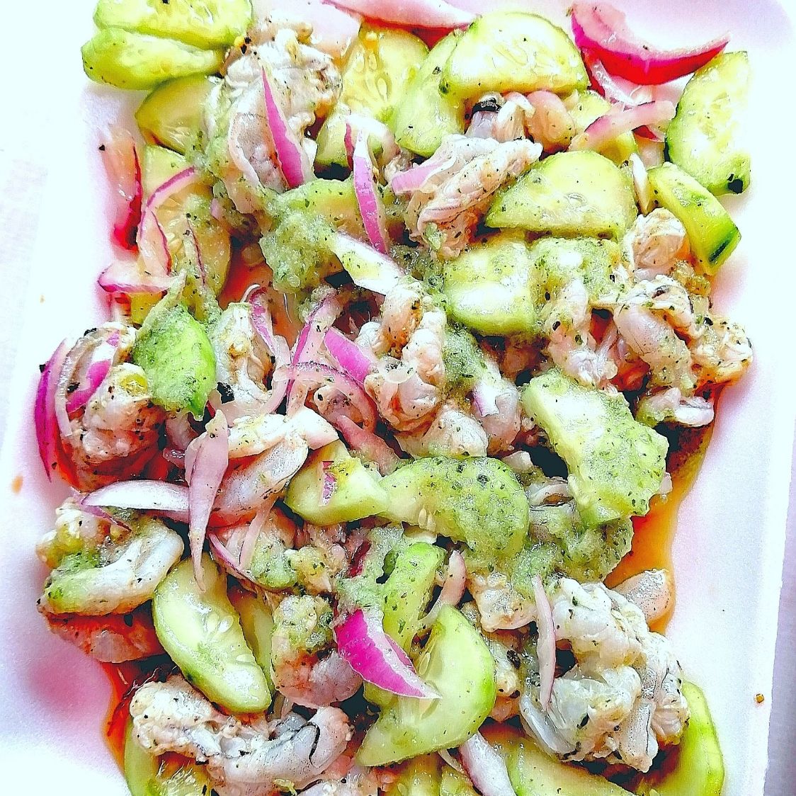 Camarón cocido y pulpo, preparado con verduras con pepino, cebolla y tomate.