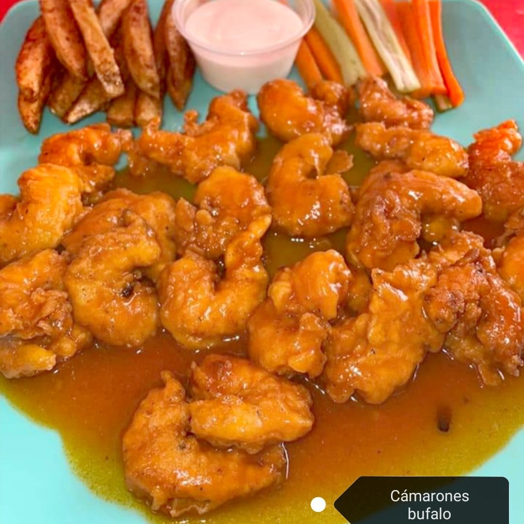 Camarones, arroz, ensalada, bolillo y aderezo.