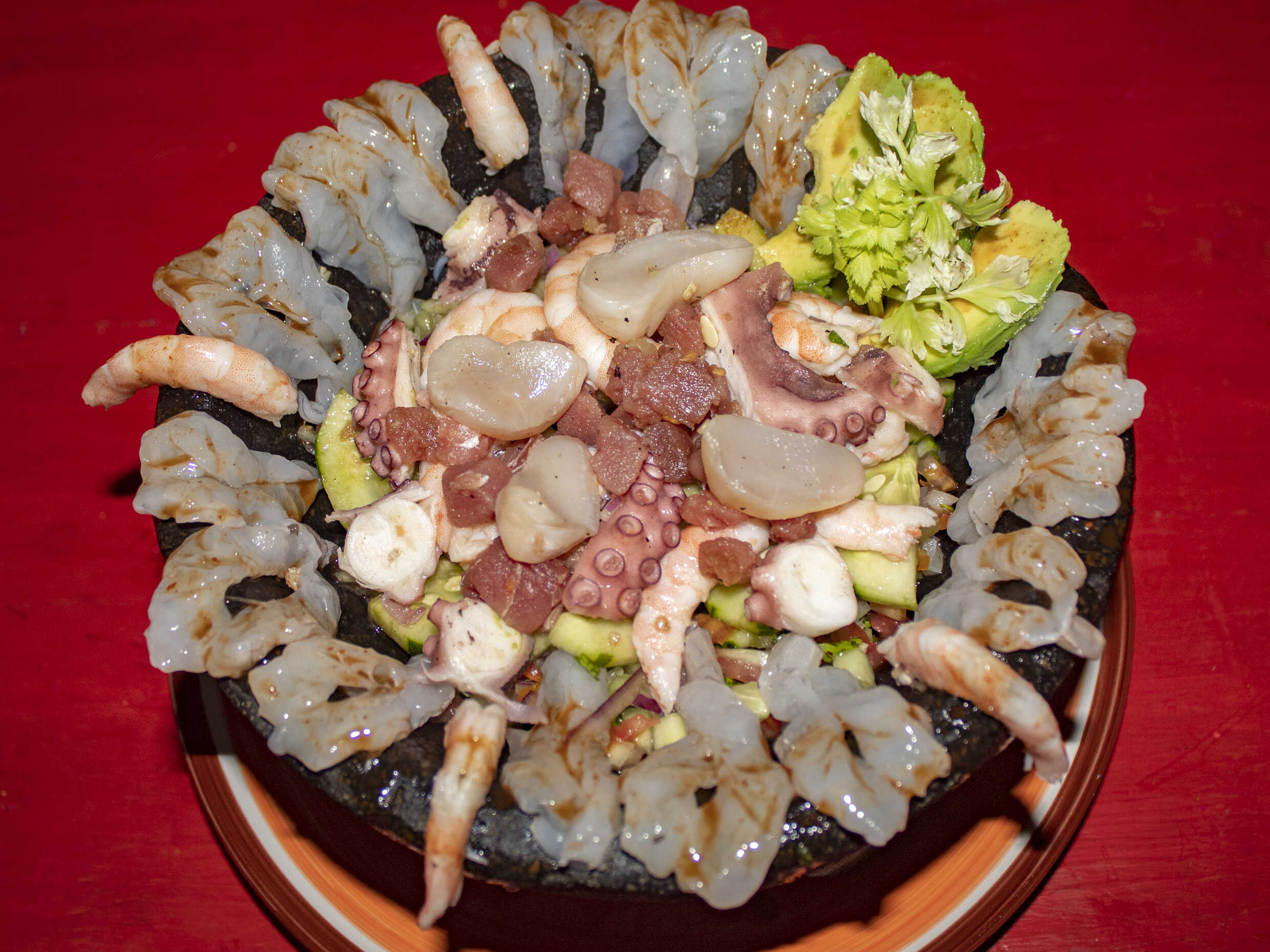 Camarón crudo, cocido, seco, pulpo, callo, pescado en cubo, atún, bañado con salsa de la casa.
