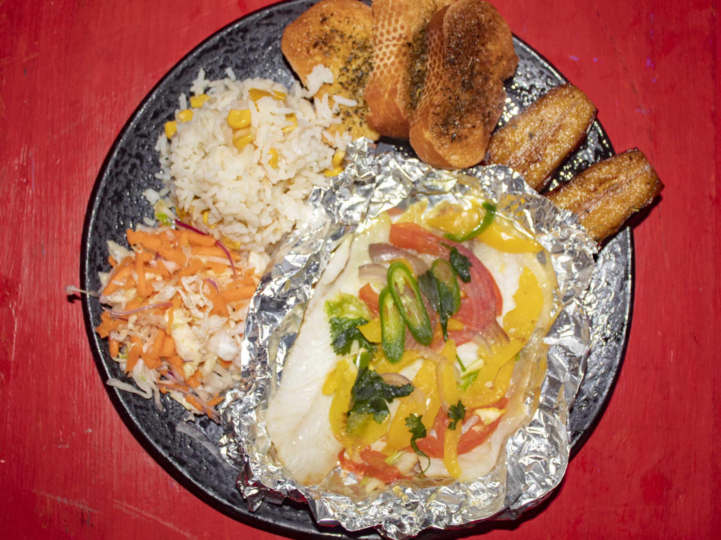Acompañado de ensalada, arroz, crotón y platanito.